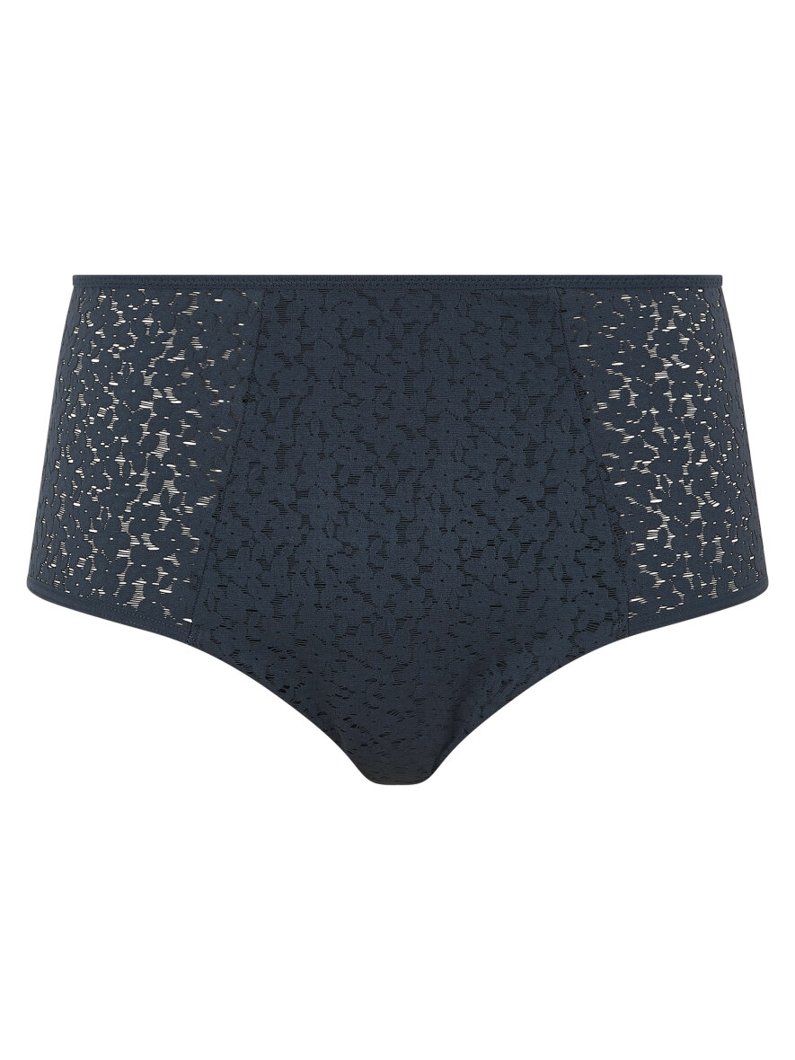 Norah trusser med blonder i mørkeblå fra Femilet. Maxi trussen er med høj tajle og har et klassisk C-snit. Trussen er med bred kant i siden med semitransparante stykker med blomstret mønster.