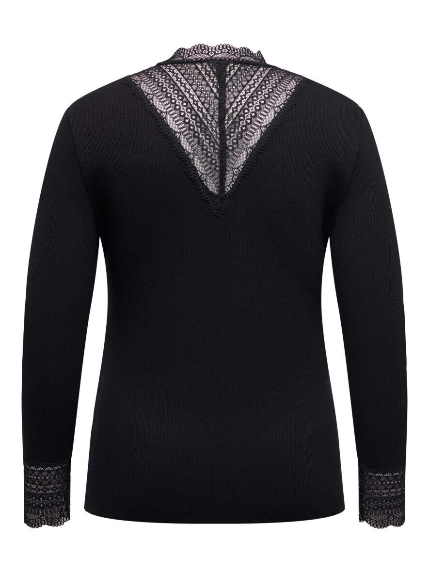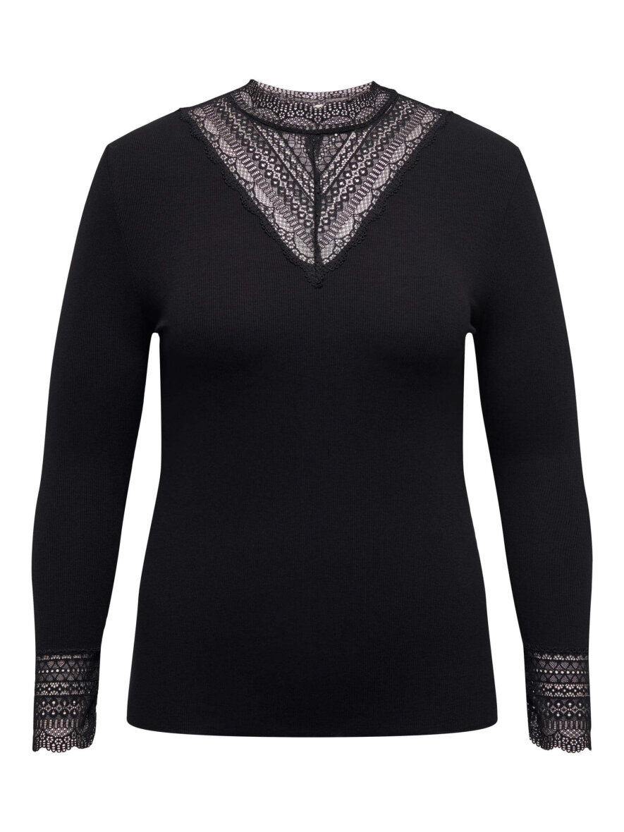 Super flot sort bluse fra ONLY Carmakoma med fine blondedetaljer. Blusen er med høj hals med blonder i en trekantet design på både fronten og bagpå, hvilket giver et fint og feminint design. Blusen er lavet i ribstrik og har en del stræk i sig og sider flot til på kroppen. Bluser er med lange ærmer med blondekant forneden.