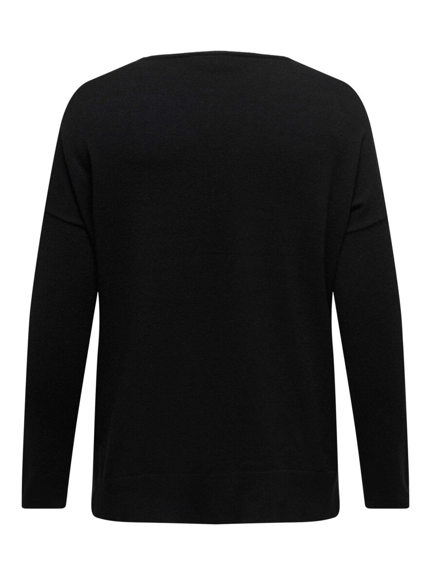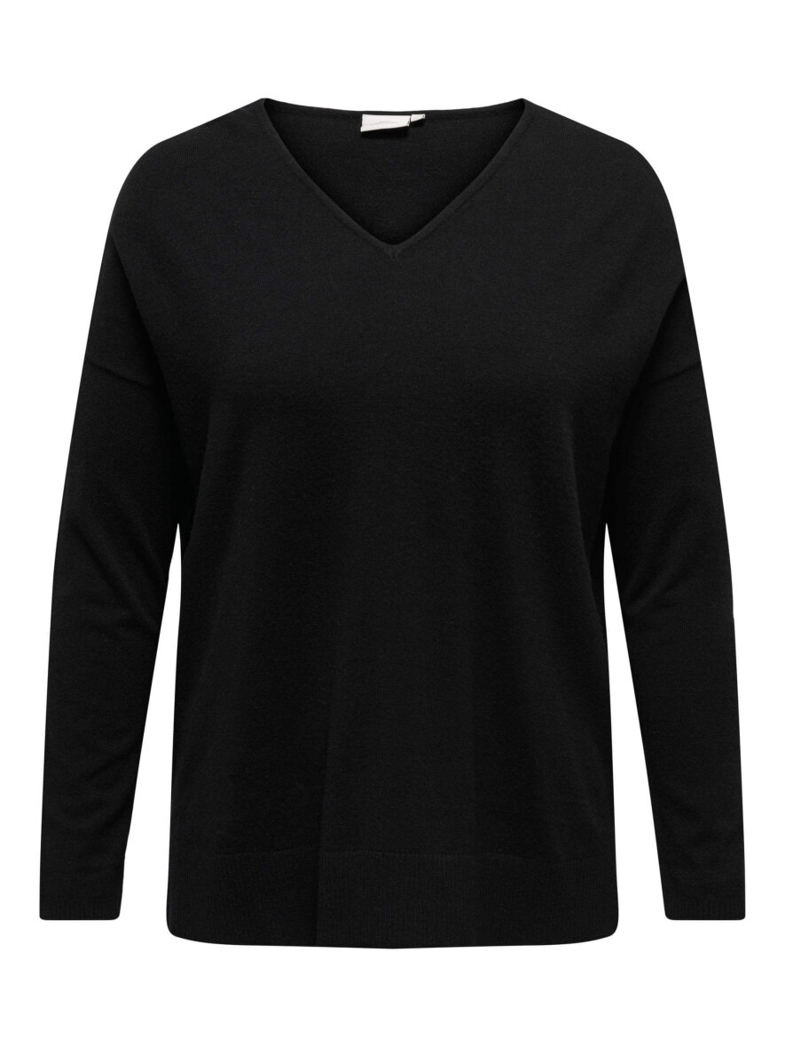 Dejlig blød striktrøje fra ONLY Carmakoma. Den sorte striktrøje er lavet i en skøn blanding af materialer som resulterer i en dejlig blød trøje som er yderst behagelig at have på. Trøjen er med V-hals og lange ærmer med ribkant. Nederst har blusen er bred ribkant med slids i siderne.