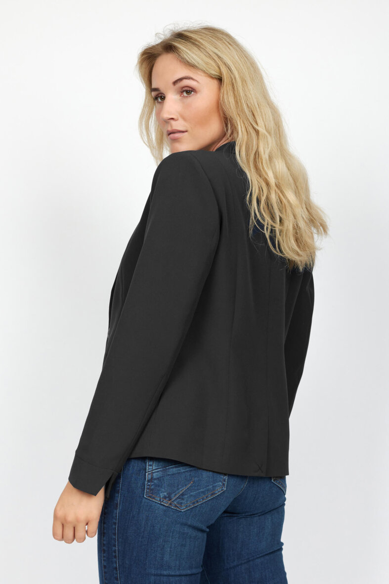 Smuk blazer i en klassisk sort farve fra 2-Biz. Blazeren er med klassisk revers og lukkes foran med en knap. To pynte forlommer med klap. Blazeren er let figursyet. Blazerens lange ærmer er med en lille slids bagpå. Blazeren er med lange ærmer med en lille slids ved håndleddet.