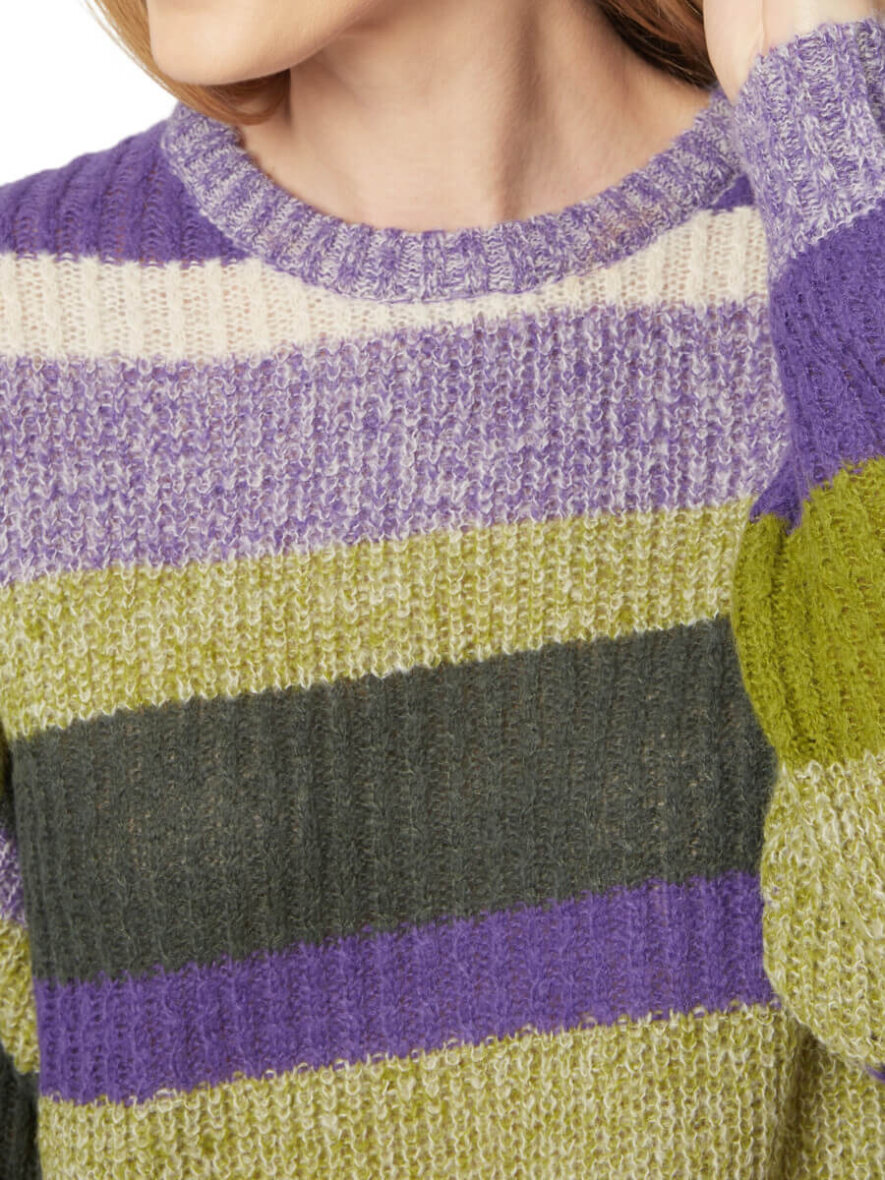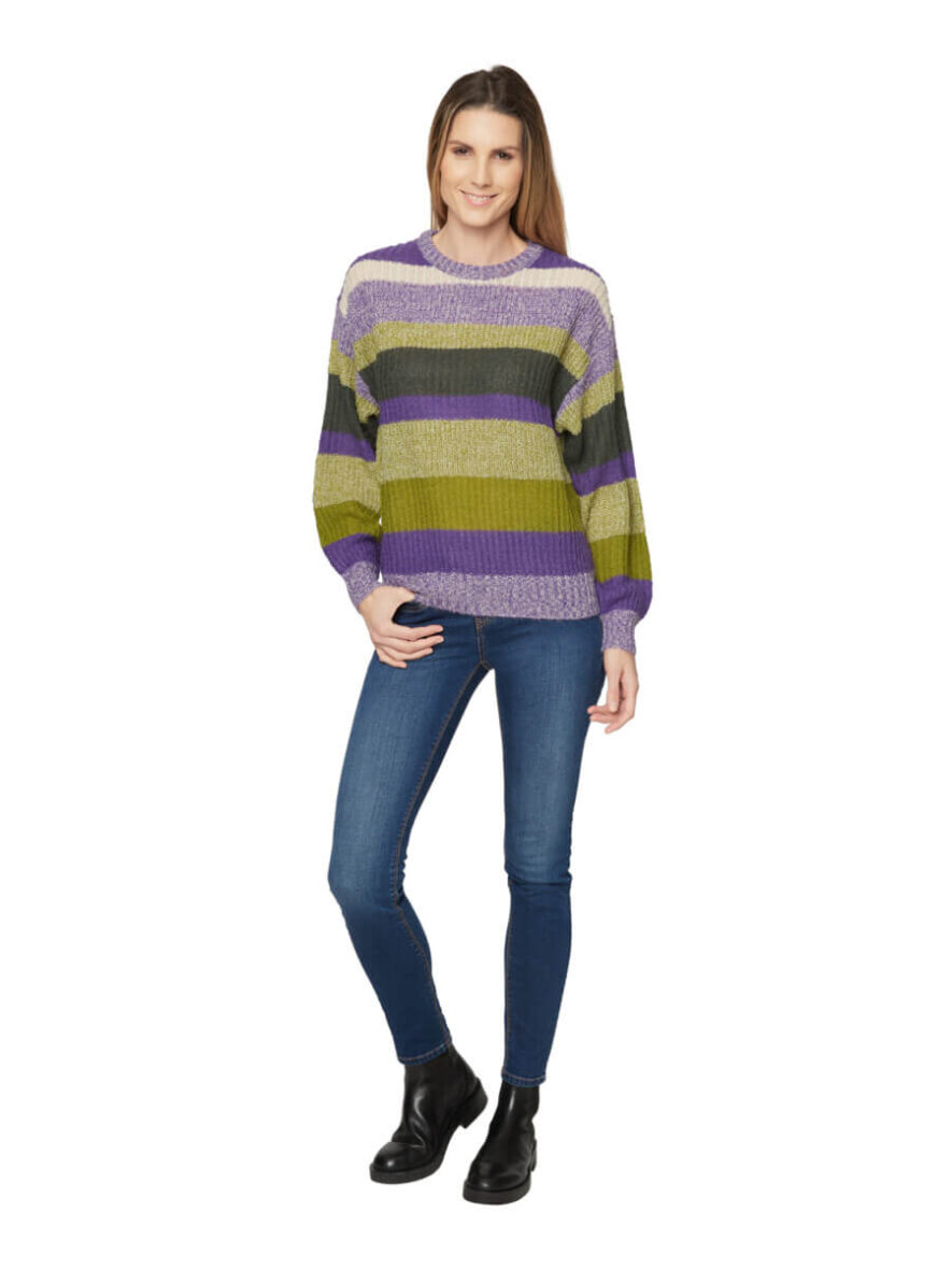 Super flot stribet striktrøje fra Brandtex. Trøjen er lavet i en skøn farve kombination af lilla og grønne nuancer i et smart stribet design.