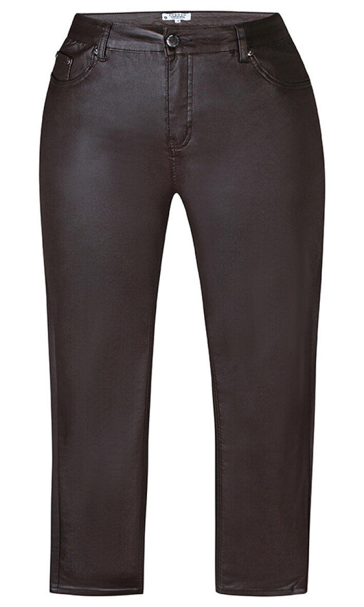 Smarte brune stomp bukser fra Zhenzi. Buksen er coated i læder look. Stomp bukser er en buks med legging fit, hvilket betyder at den er almindelig rummelig foroven, hvor benene bliver smalle ned ad.