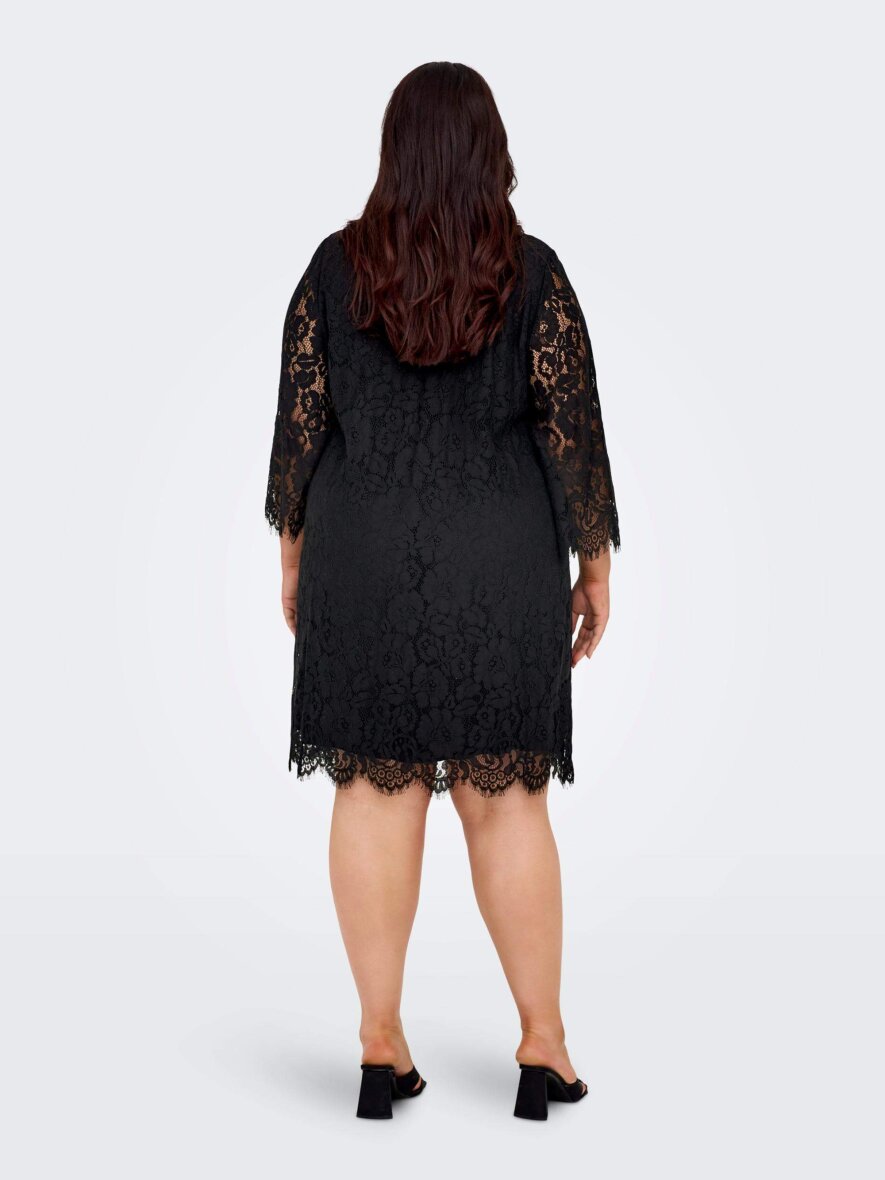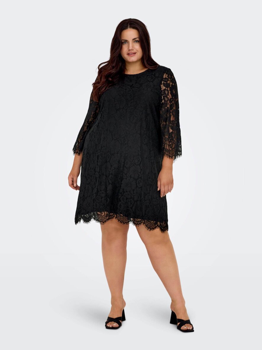 Smuk knælang kjole fra ONLY Carmakoma. Kjolen er med et smukt blondedesign i blomstret mønster. Kjolen er med en påsyet underkjole i 100% viskose grundet kjolens transparente blonder. Kjolen er med rund hals og 3/4 lange ærmer i blonder.