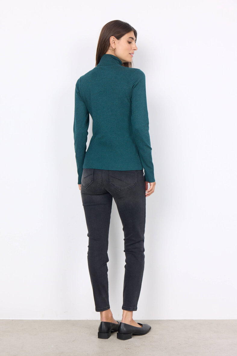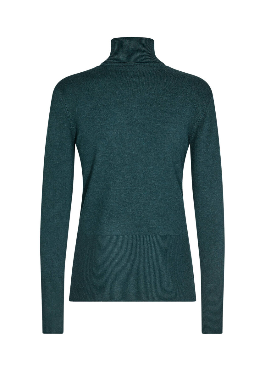 Lækker blød strikbluse i en skøn grøn farve fra Soyaconcept. Blusen er med rulle krave med rib. Lange ærmer med høj ribkant samt høj ribkant nederst, hvilket giver et flot design til blusen.