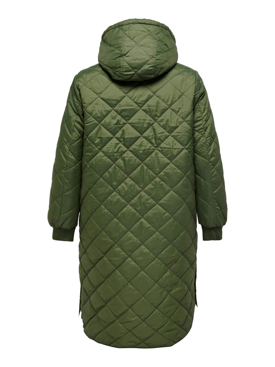 Flot army grøn jakke i quiltet design fra ONLY Carmakoma. Den quiltede jakke er med hætte med bindebånd. Jakken er med plys for i den øverste del. Jakken er med lynlås langs fronten og to forlommer med trykknap. Vindfang ved håndleddet, så man kan holde på varmen. Jakken er med tre knapper i siderne som kan åbnes til slids.