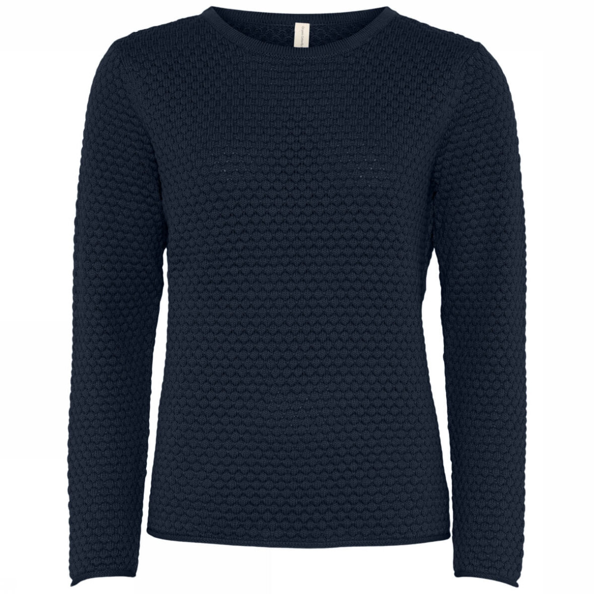 Flot og enkel striktrøje fra Skovhuus. Striktrøjen er lavet i et skønt boblemønster i en flot mørkeblå farve, som kan bruges til alle sæsoner. Trøjen er med rund hals og lange ærmer med mørkeblå ribkant ved alle åbninger.