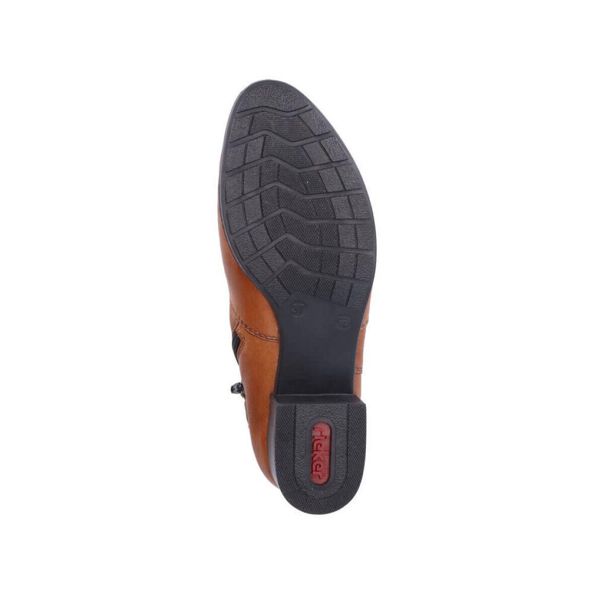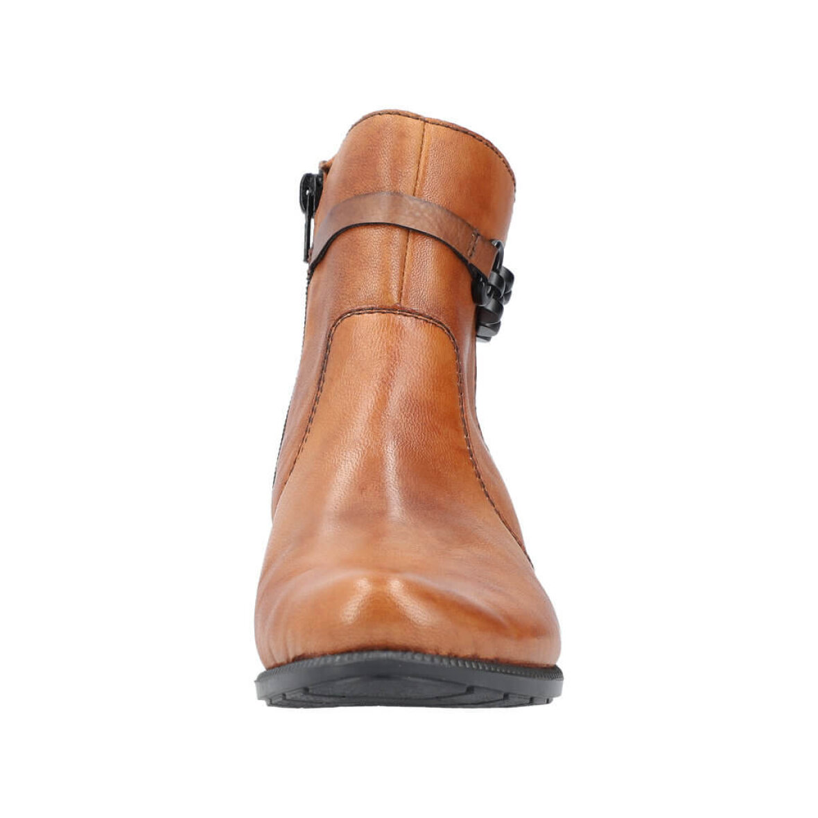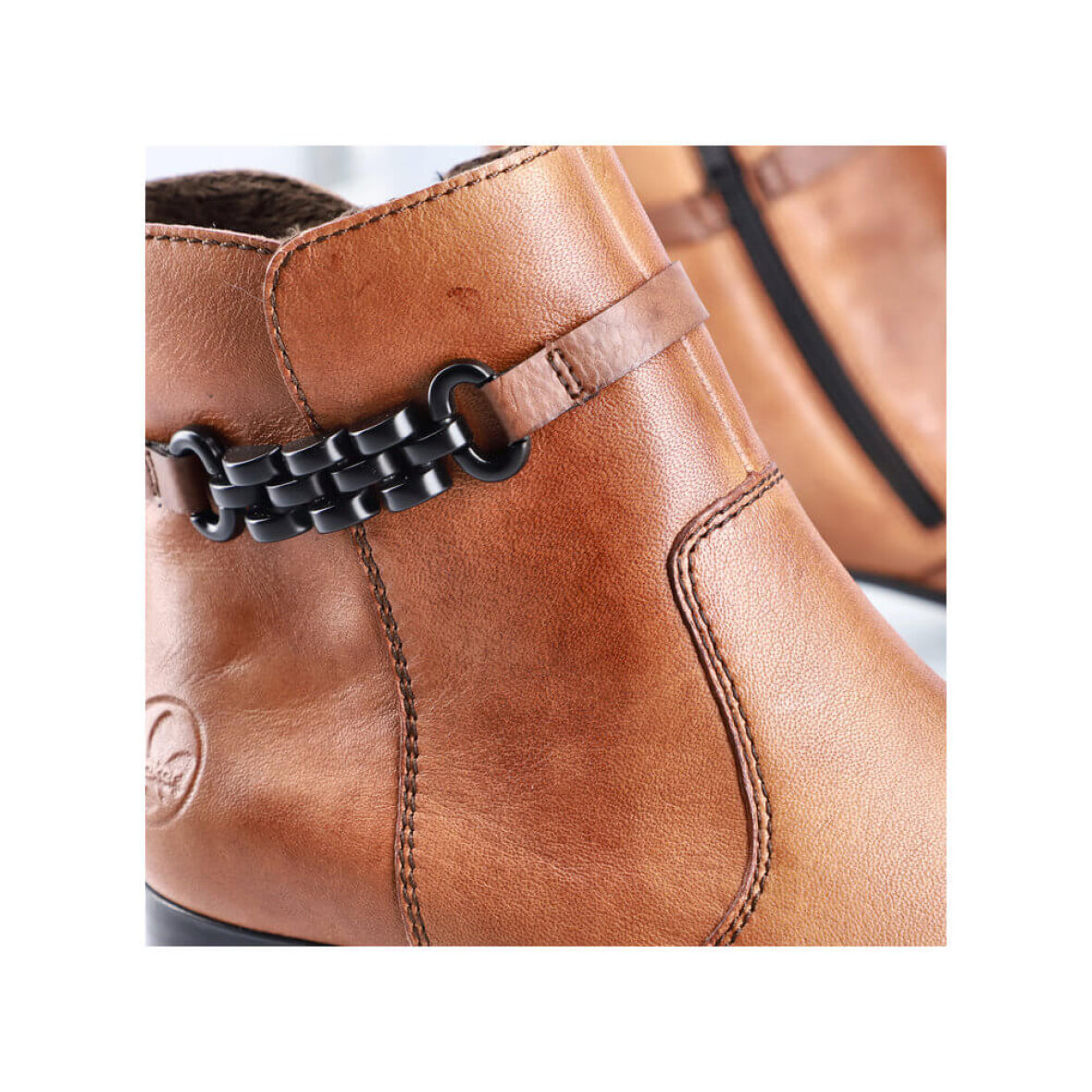 Flot brun Rieker støvle til kvinder. Støvlen er lavet i et velkendt Rieker design med en fin detalje med en tynd påsyet rem og dekorativ kæde på ydersiden af støvlen.