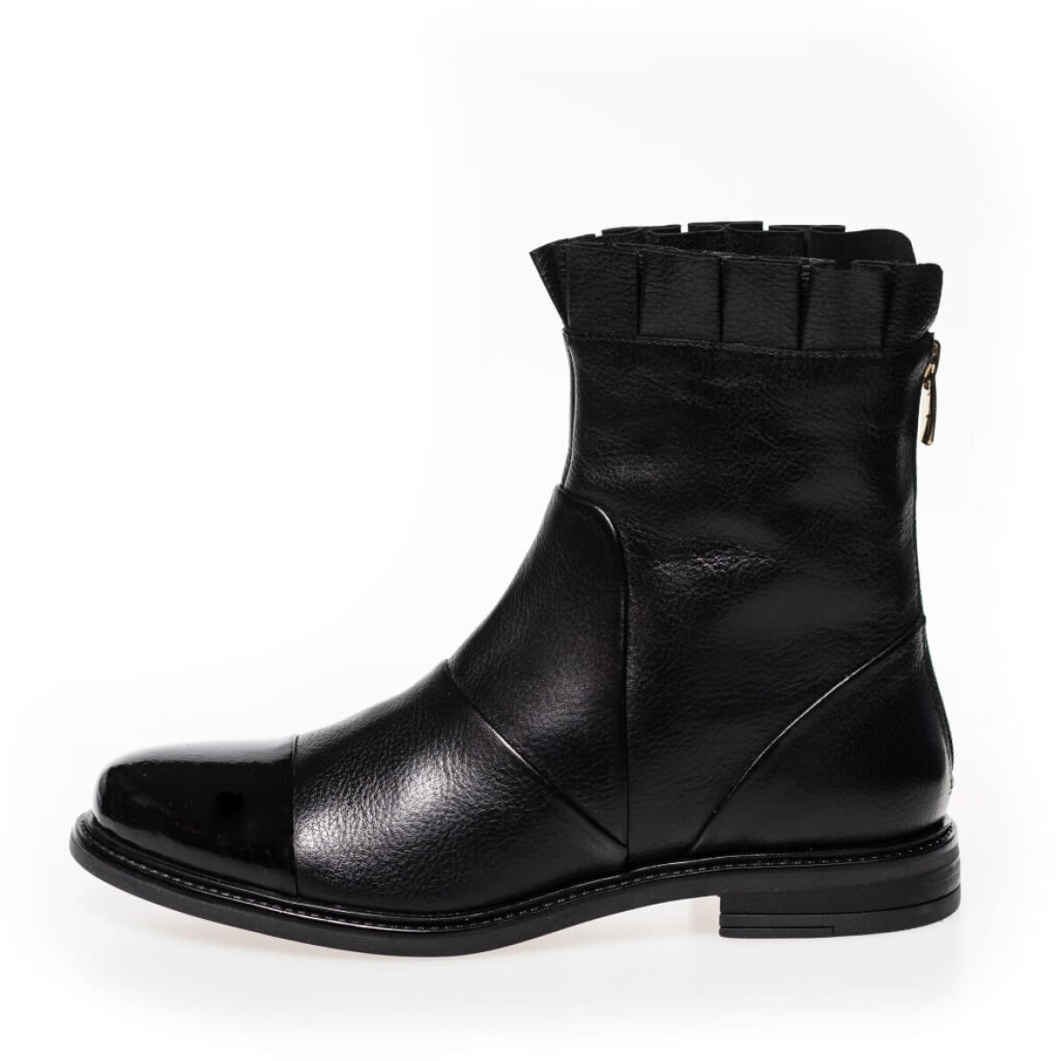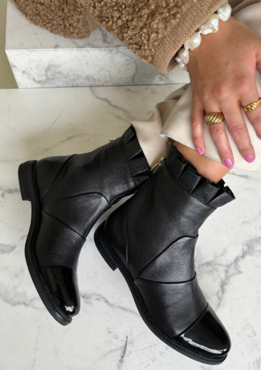 Flotte ankelstøvler fra Copenhagen Shoes. Magaret støvlen er lavet i blødt læder med en blød flæsekant ved åbningen. Støvlen er med lynlås bagpå, så den er nem at få af og på. Støvlen er med en fed detalje med læder patent lak look på snuden.