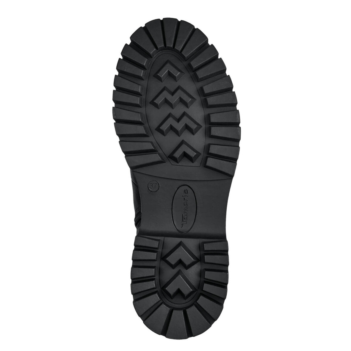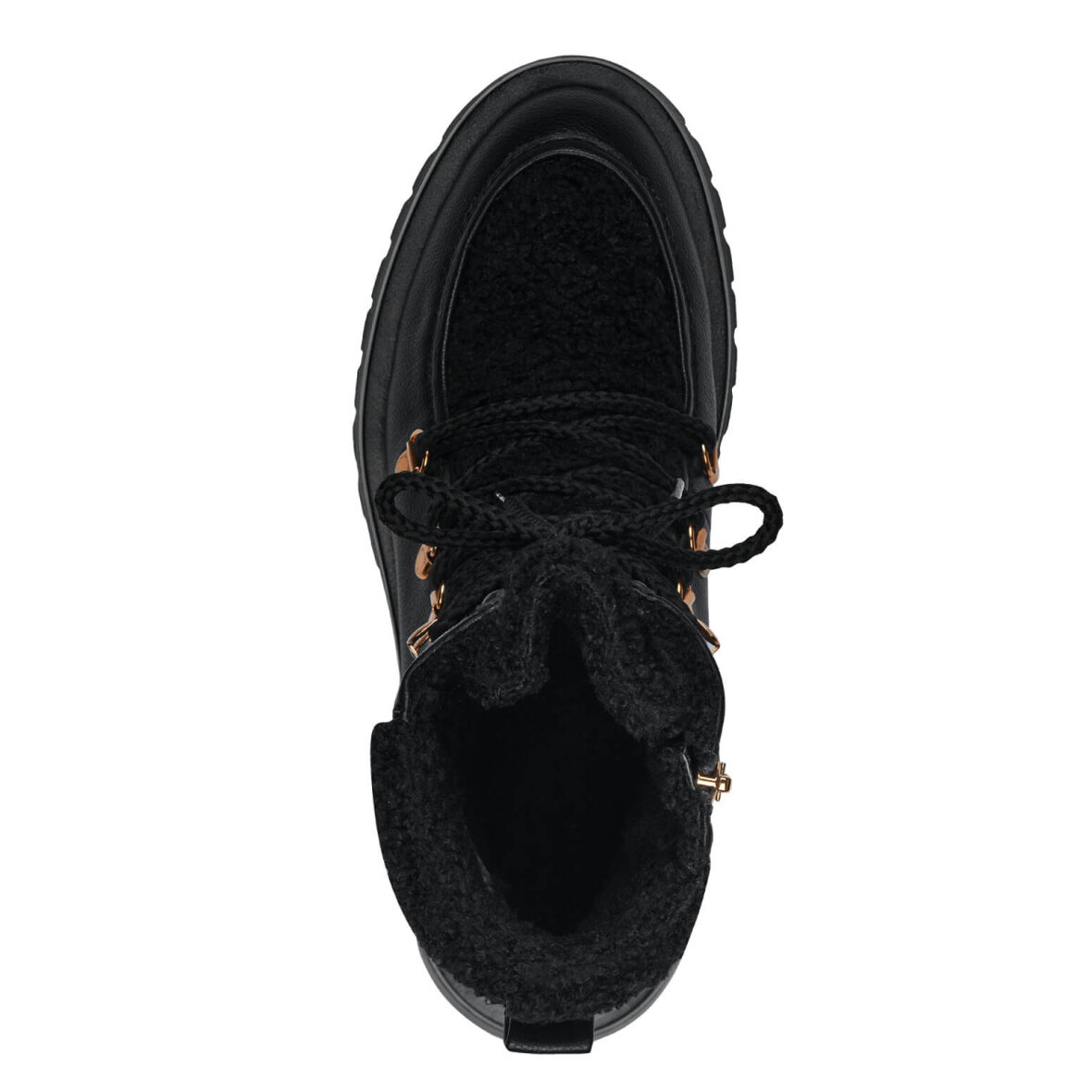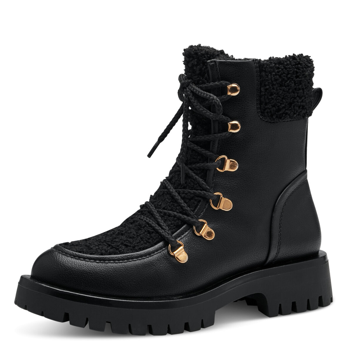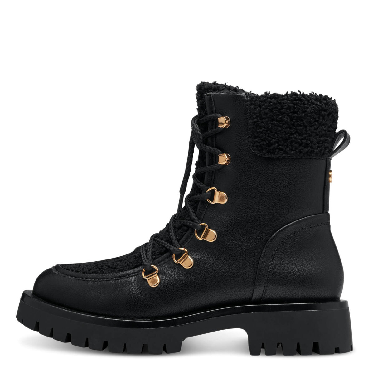 Flot vinterstøvle fra Tamaris. Støvlen er lavet i imiteret skind med sort plys på fronten og skoens åbning, som er en flot detalje og giver et vinterligt look. Støvlen er med lynlås på indersiden, så den er nem at få af og på. Støvlen kan justeres med snørebånd foran.