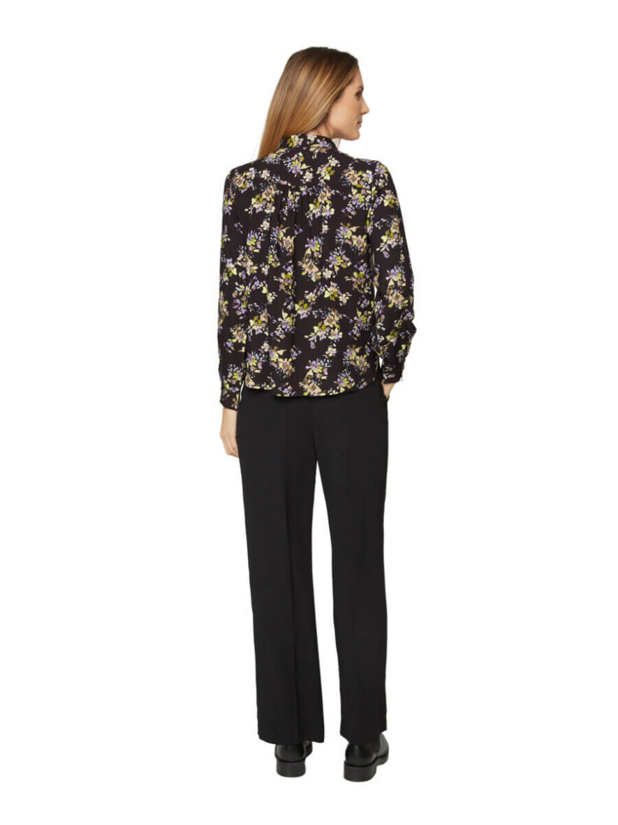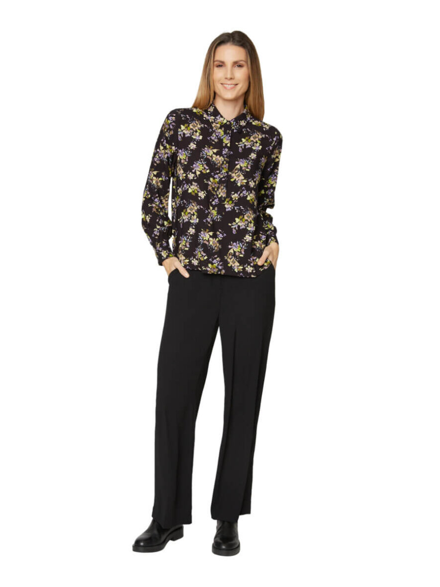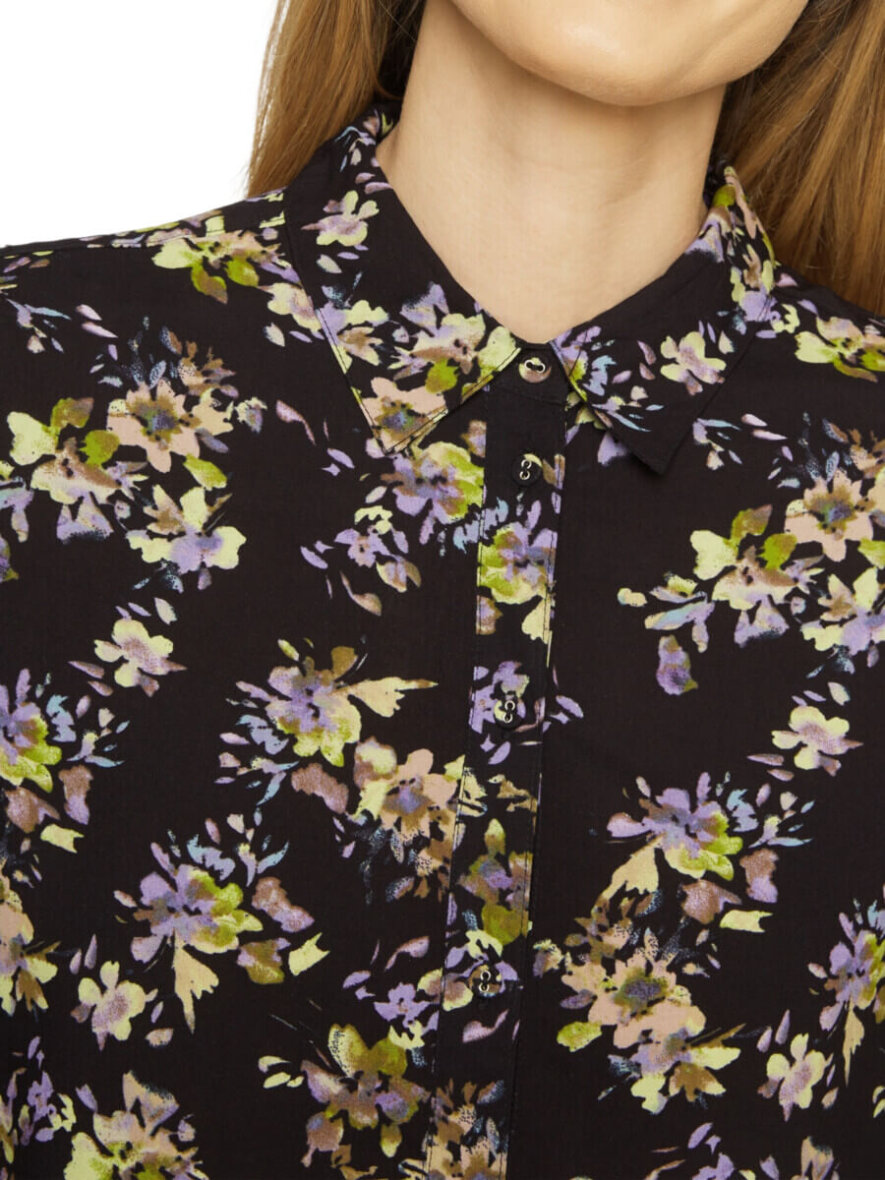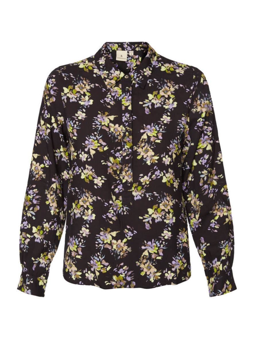 Smuk bluse fra Brandtex i flot blomstret i en skøn farvekombination. Blusen er med krave og stolpeluk med knapper foran. Blusen er med lange ærmer og knapluk ved håndleddet.