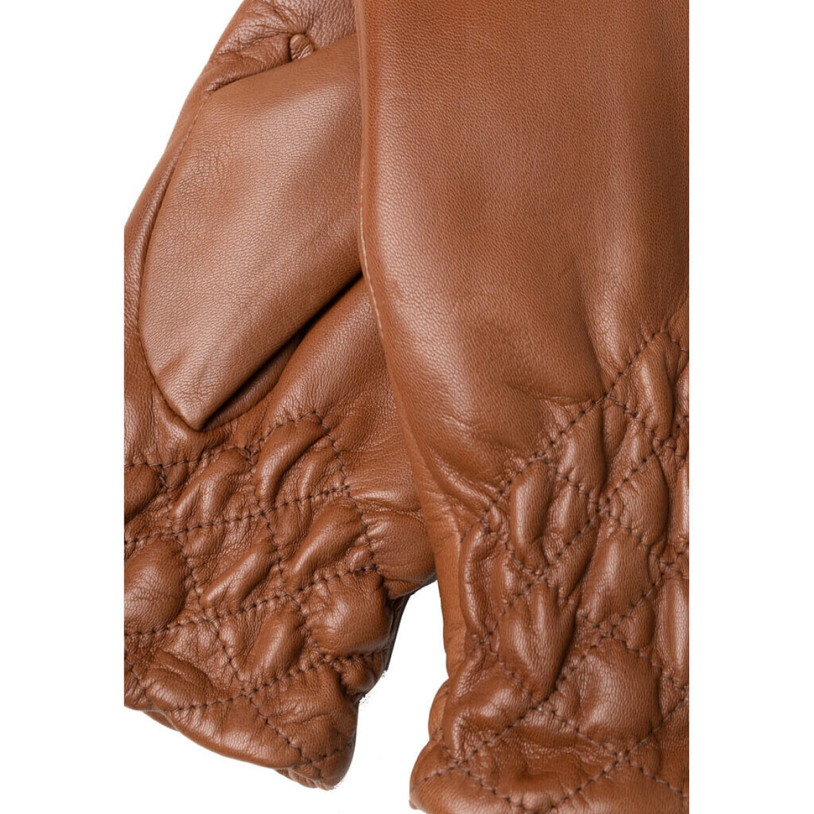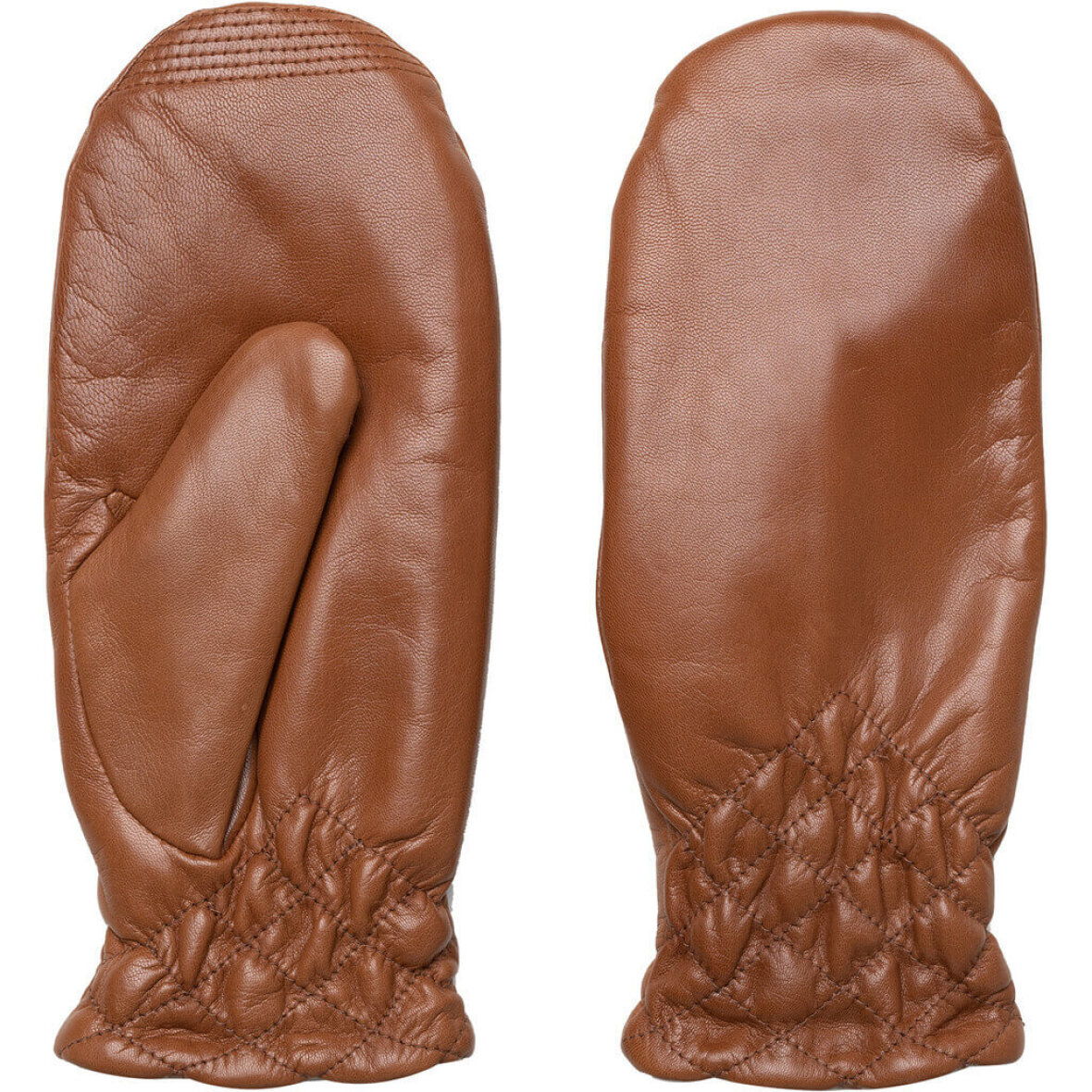 Super lækre cognac farvede vanter lavet i blød 100% skind fra Re:Designed. Elke vanten er lavet med fine synings detaljer og rynke detalje ved håndleddet, hvilket giver et flot og sofistikeret udtryk.
