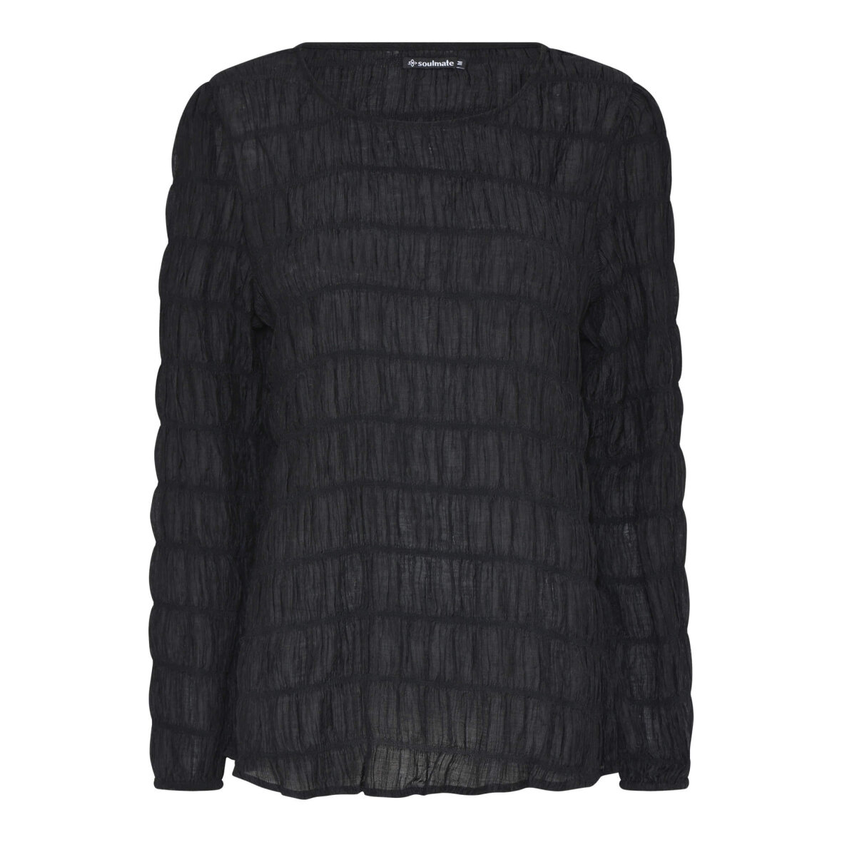 Flot og feminin bluse fra Soulmate i et semitransparent materiale. Blusen er lavet i et løst smock look. Blusen er med rund hals og lange ærmer med elastik i håndleddet.
