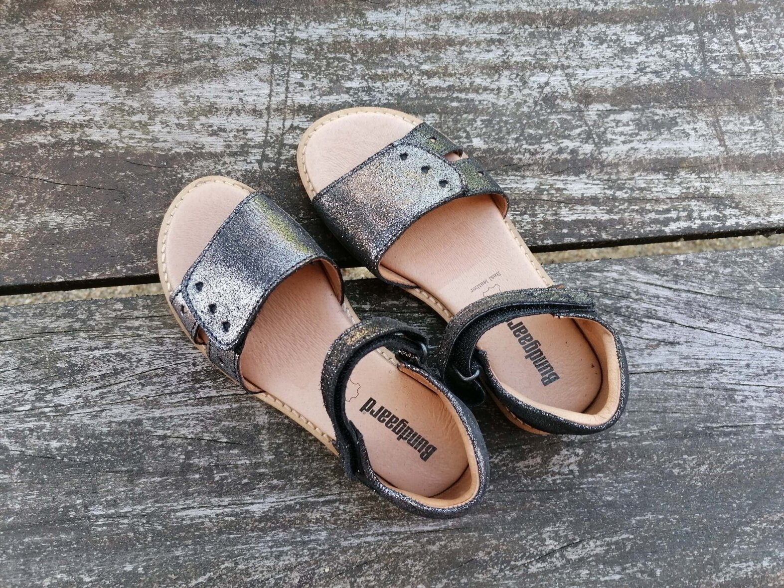 Flotte sorte sandaler med fin glitter effekt i skindet. Sandalen reguleres omkring anklen, har en god pasform og velcroluk.