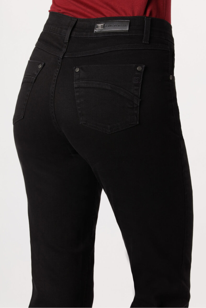 Smarte højtaljede jeans i sort fra Bessie. Buksen er lavet i et klassisk jeans design med knapluk og lynlås foran, bæltestropper samt 5-lommer.