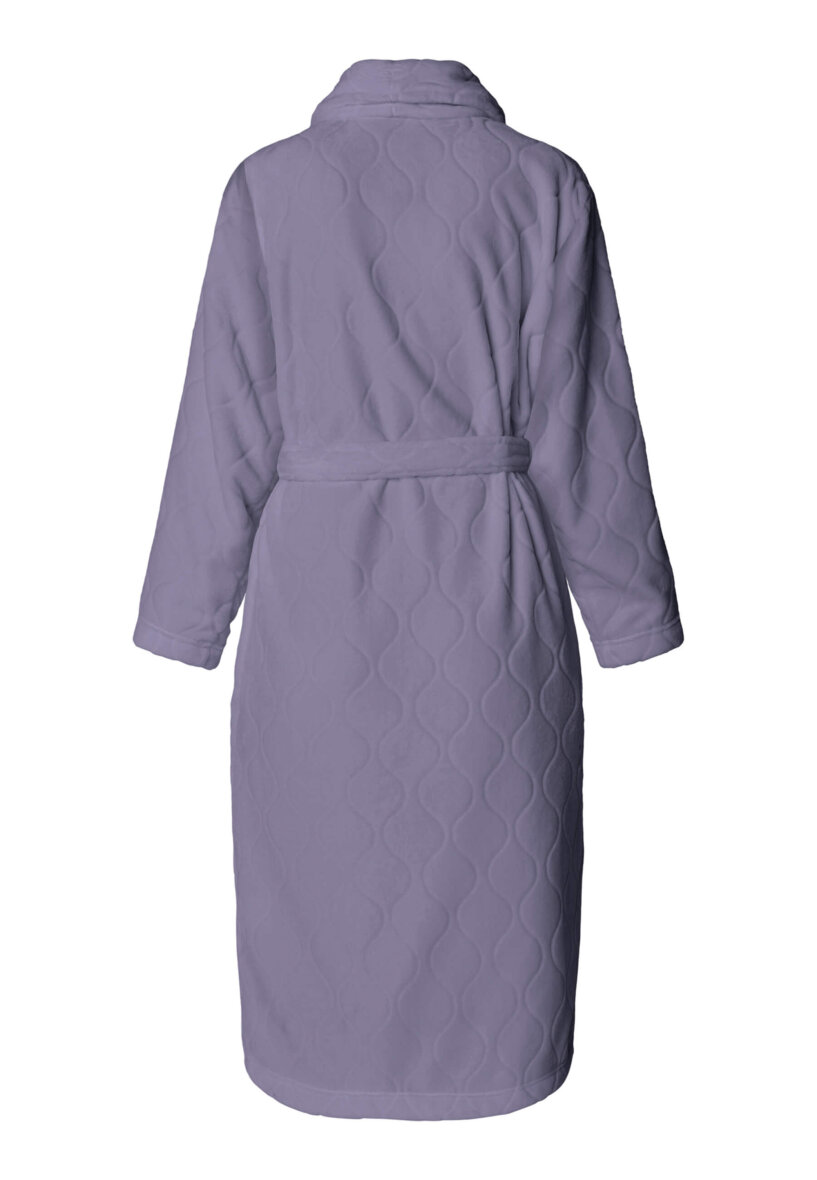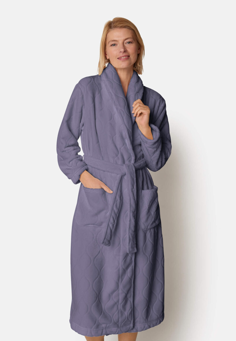 Flot lilla morgenkåbe i en fint mønster fra Brandtex. Morgenkåben er lavet i den dejligste bløde kvalitet af 100% polyester.
