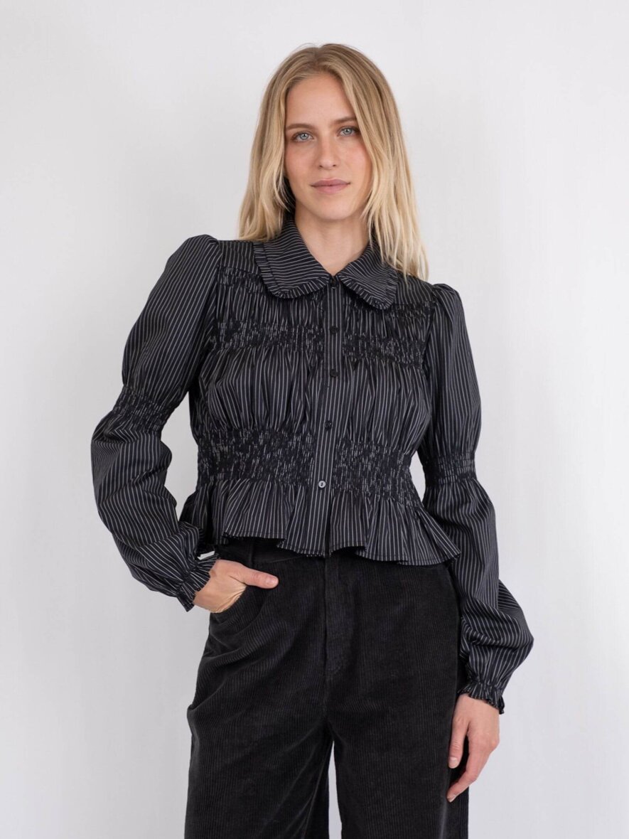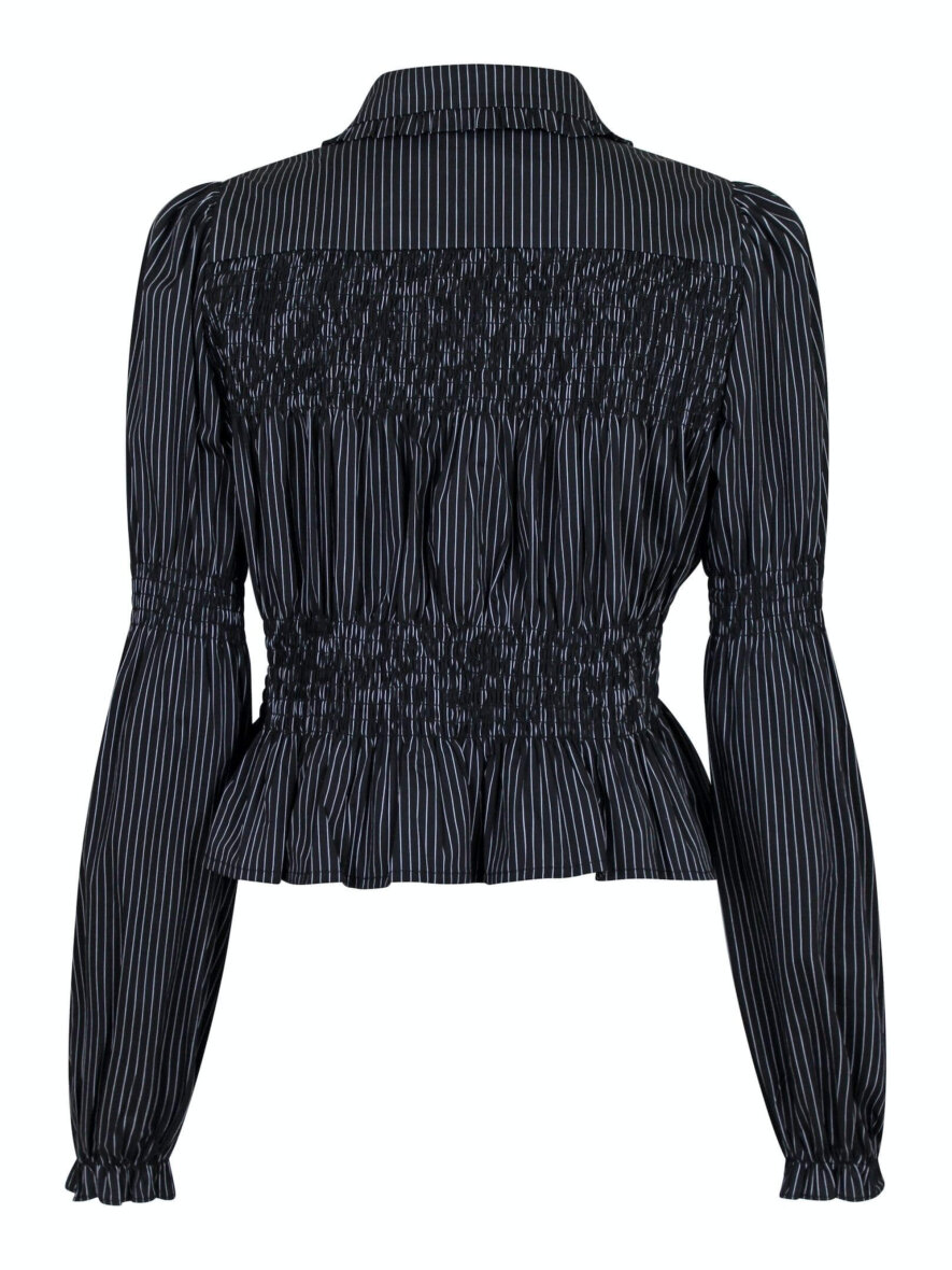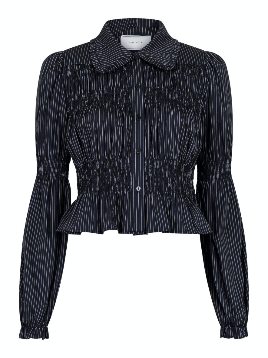 Cool skjorte med fine smock detaljer fra Neo Noir. Skjorten er med krave med flæse detaljer og gennemgående knapper foran. Skjortens lange ærmer afsluttes med elastik og flæse detalje ved håndleddet. Skjorten er lavet i et flot stribet design med smock elementer som skaber en flot figur når man har skjorten på.