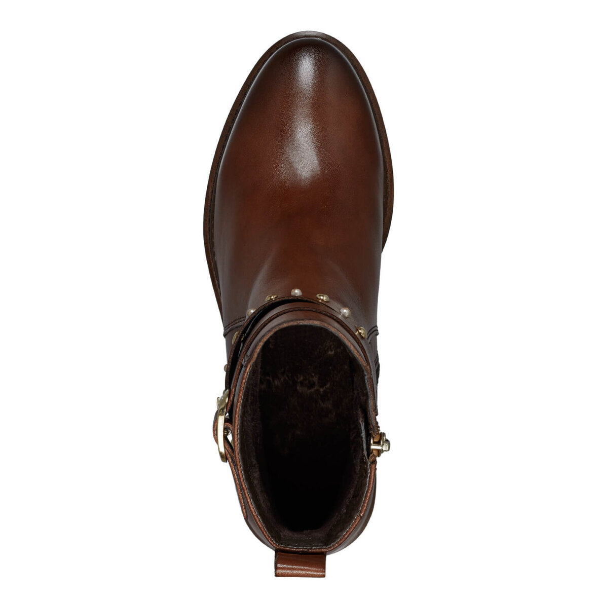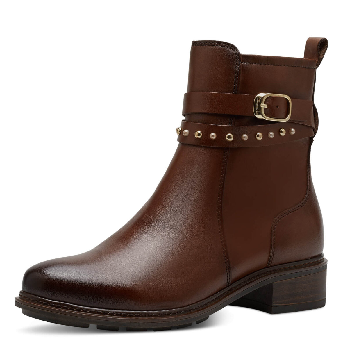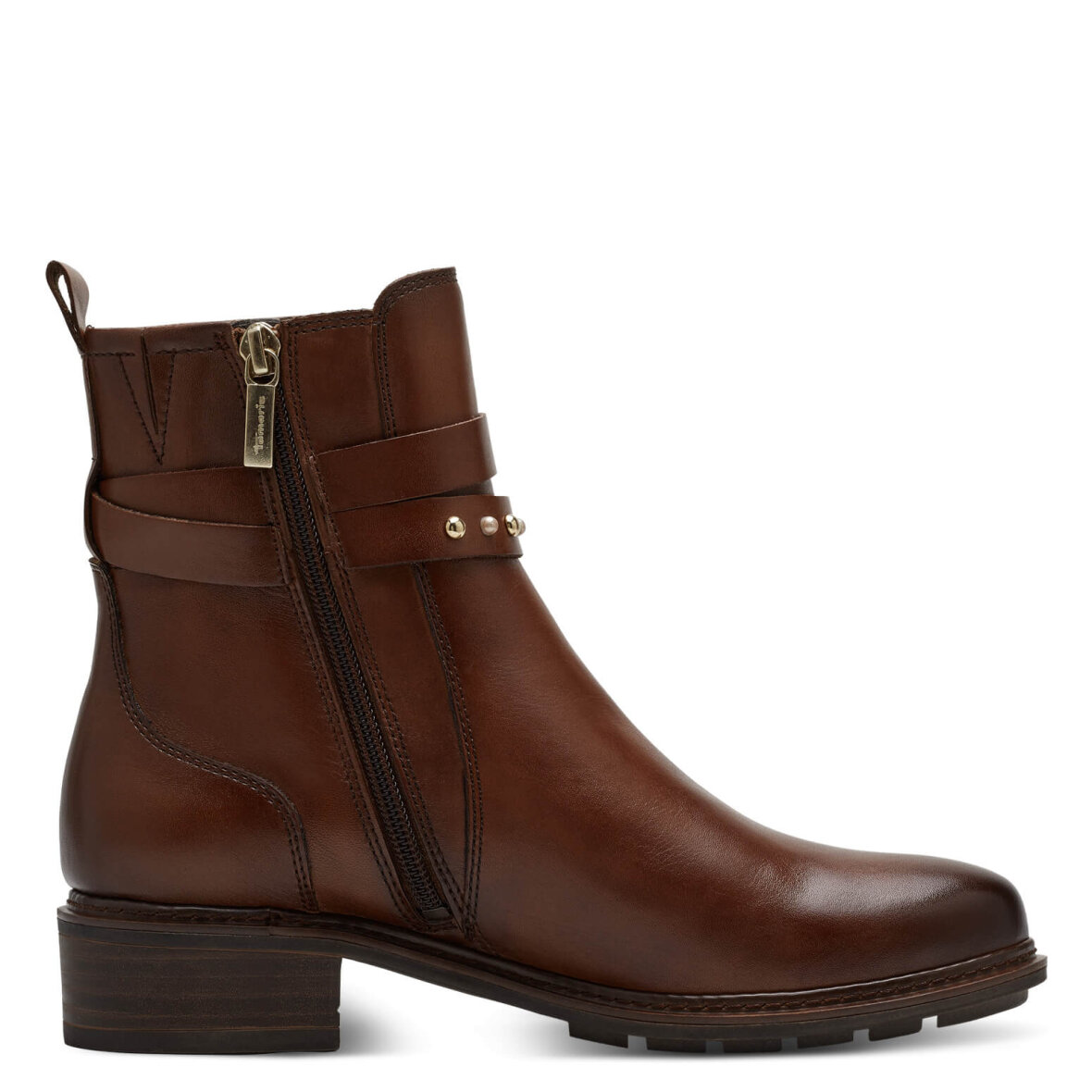 Flot klassisk brun støvle med fine detaljer fra Tamaris. Den velkendte støvle model er med to dekorative remme på ydersiden, hvor den ende er med spænde og den anden med nitter/perler på.