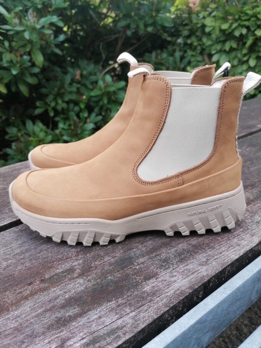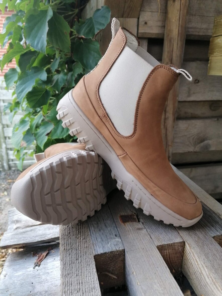 Flot og komfortabel støvle i modellen Le Chelsea Suede fra Woden. Støvlen er lavet i en flot lysebrun farve, som nemt kan styles med de moderne naturfarver der trender i sæsonen. Støvlen er lavet i et flot og enkelt design samt Woden ikoniske fiskelæder bagpå, hvilket fuldender støvlens flotte design.