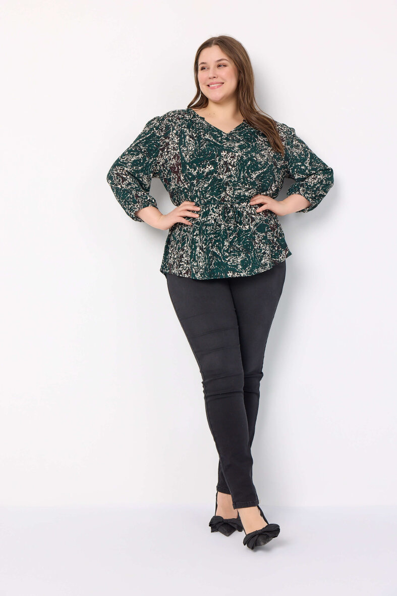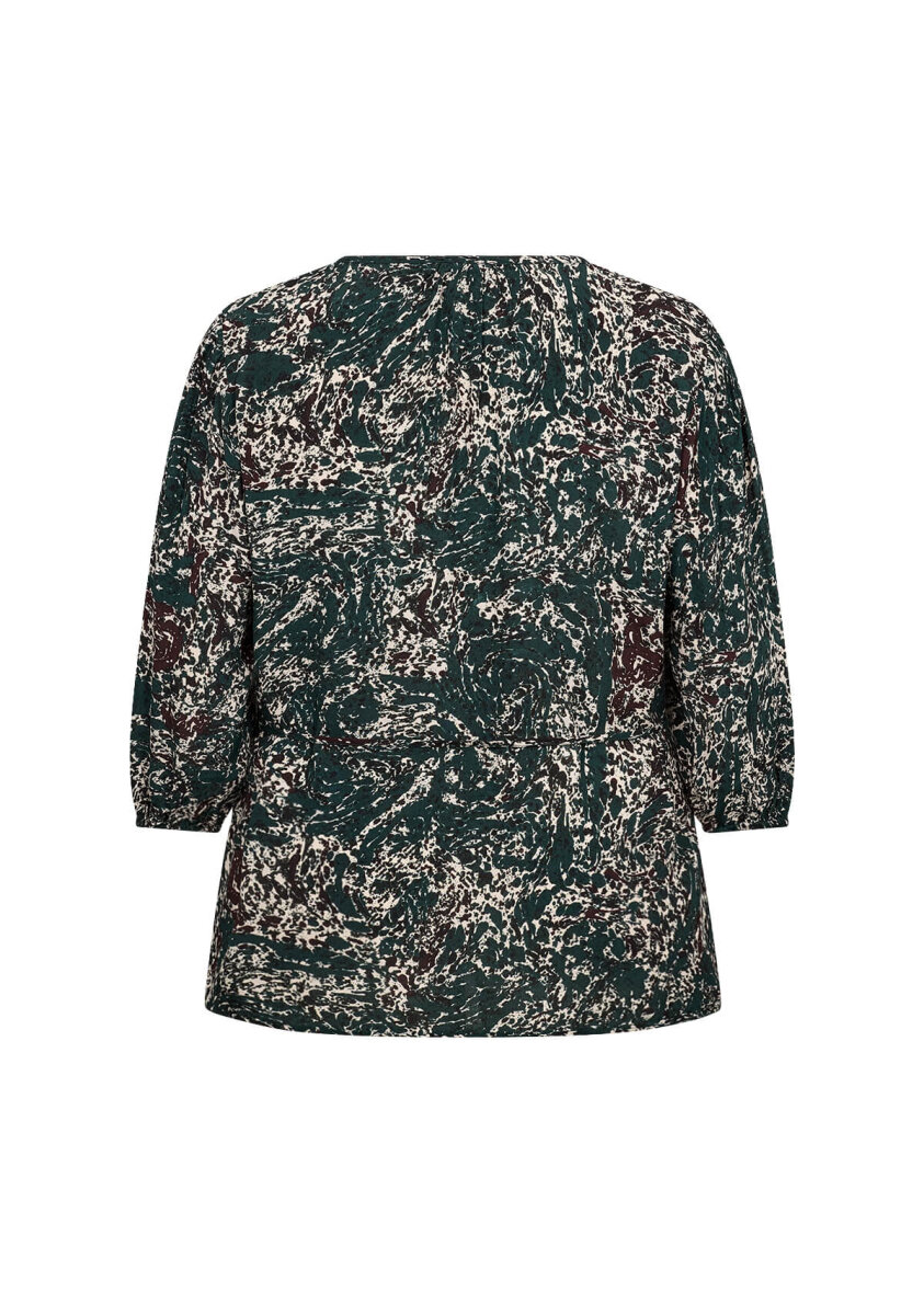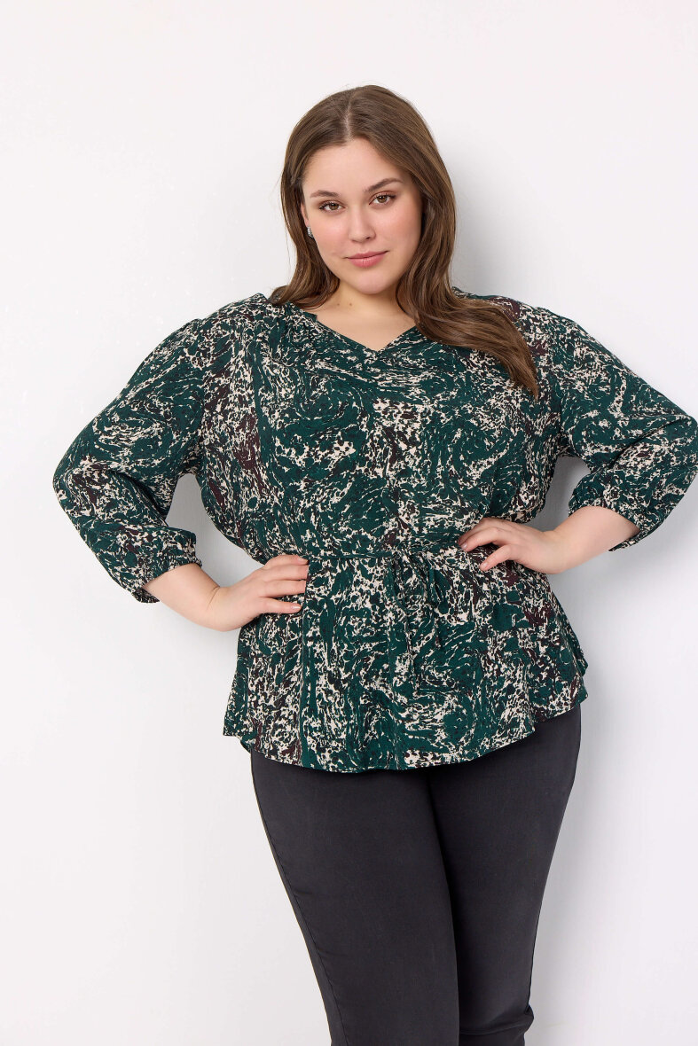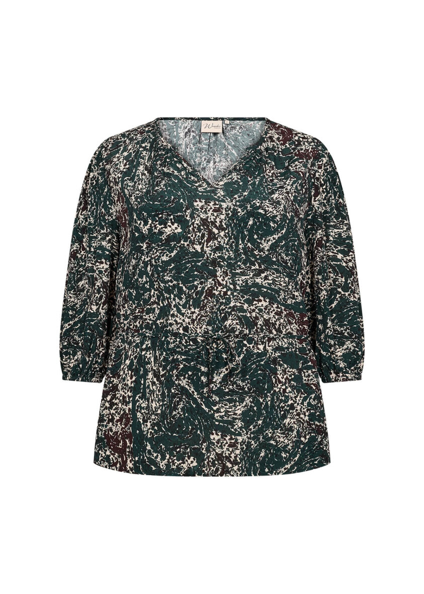 Flot og feminin bluse fra Wasabiconcept i et skønt print og mørkegrønne toner. Blusen er lavet i en dejlig blød 100% bæredygtigt viskose kvalitet, som er yderst behagelig at have på.