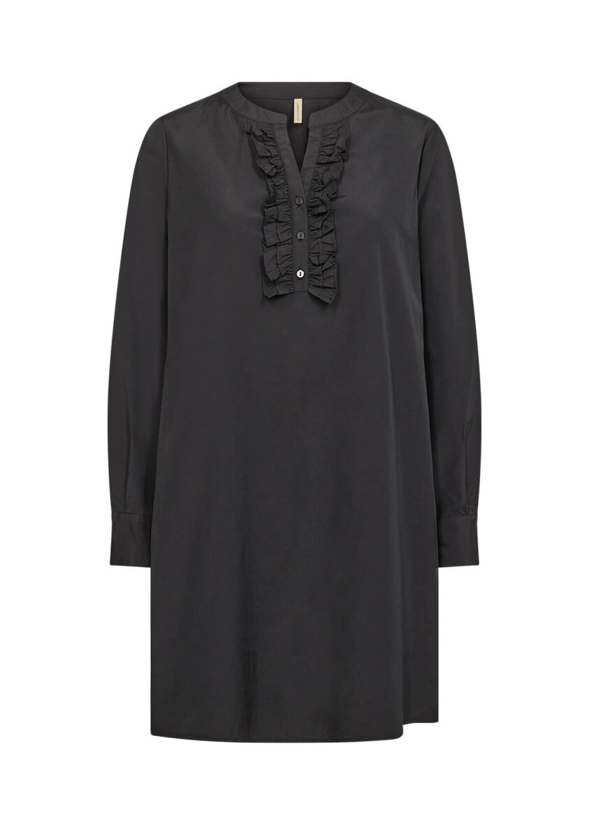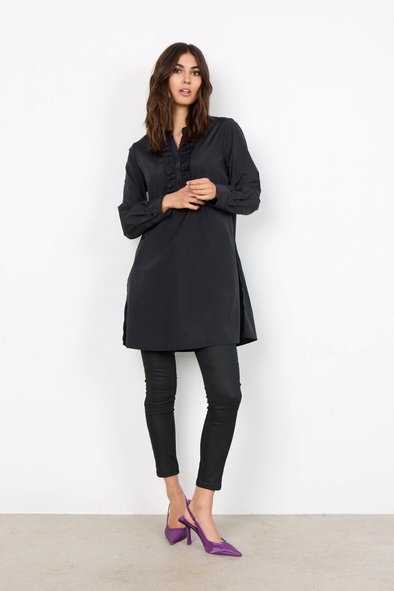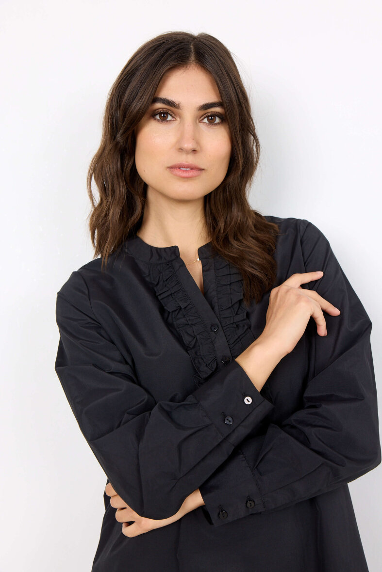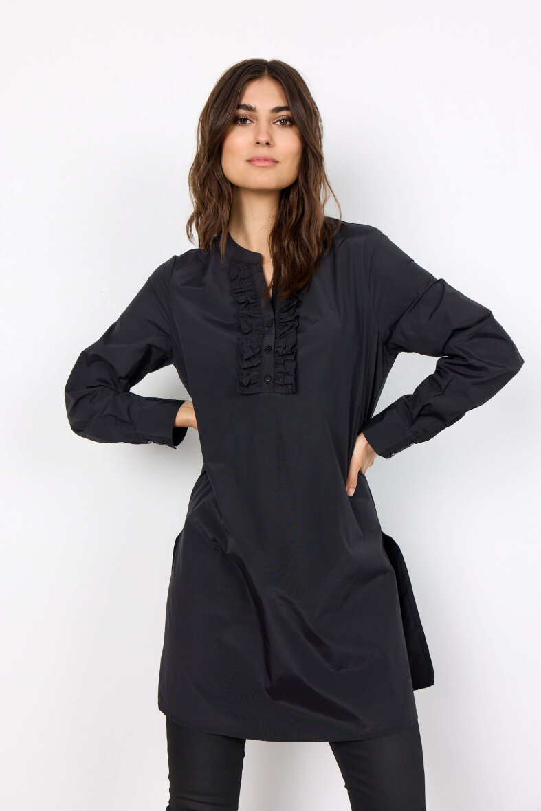 Flot sort tunika med fine detaljer fra Soyaconcept. Tunikaen er med en flot flæse detalje foran, hvilket giver et feminint udtryk. Tunikaen er med rund hals med v-halsudskæring og lange ærmer med manchetluk.