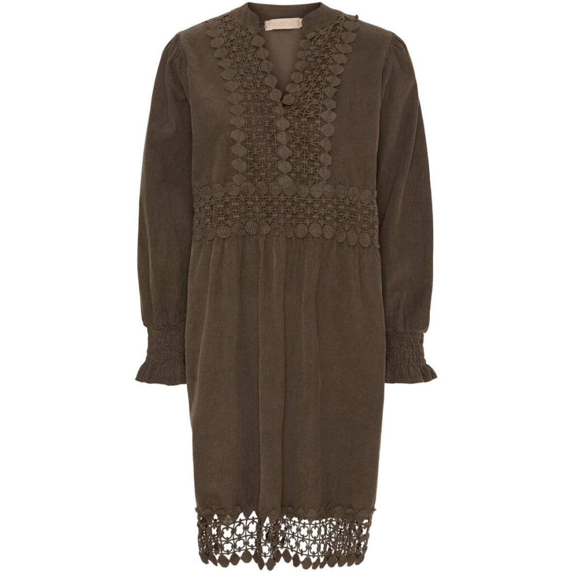 Smuk brun kjole fra Marta Du Chateau med fine og feminine detaljer. Kjolen er lavet i en lækker blød fløjls kvalitet i 100% bomuld.