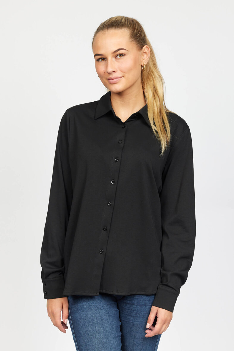 IDINES er en flot sort skjorte til kvinder fra 2-Biz. Skjorten er lavet i en dejlig blød 100% bomuldskvalitet, som er yderst behagelig at have på. Skjorten er lavet i et klassisk skjortedesign med krave, gennemgående knapper foran og lange ærmer med manchet.