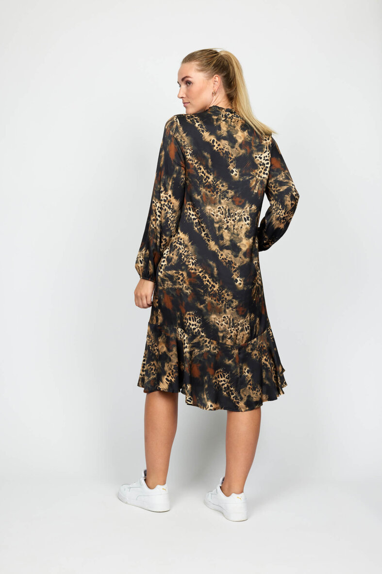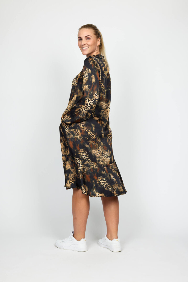 Smuk mellemlang kjole i det fineste print fra 2-Biz. Det smukke mix af print og farvekombination passer perfekt til efterårs- og vintergarderoben, hvor dyreprint er yderst moderne.