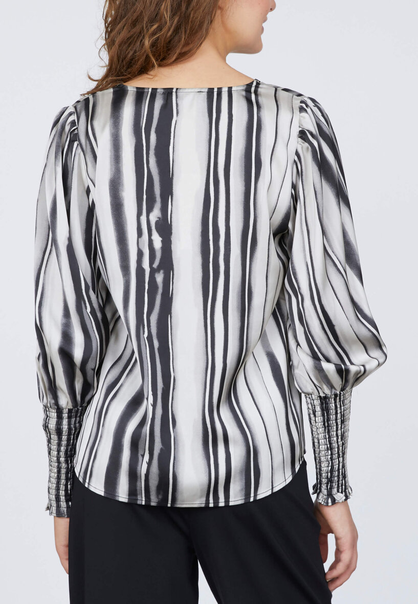 Blusen er med v-halsudskæring med lange ærmer med et bredt smock stykke ved håndleddet.