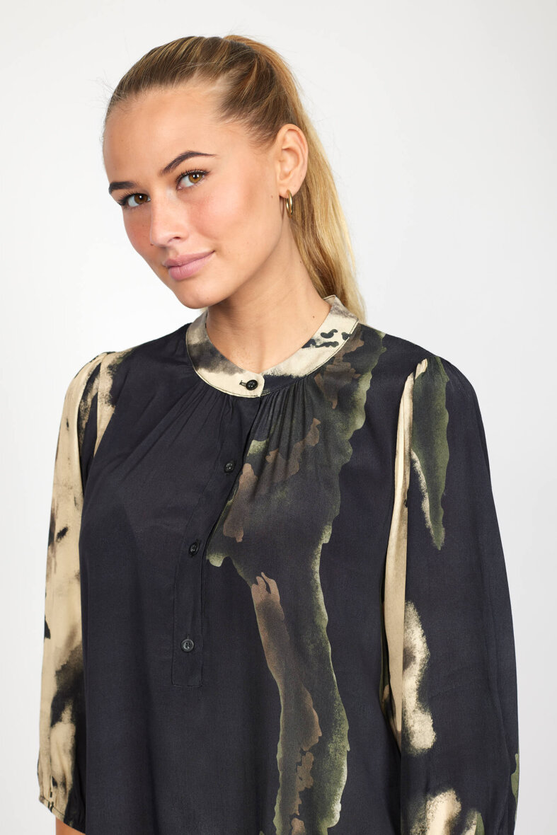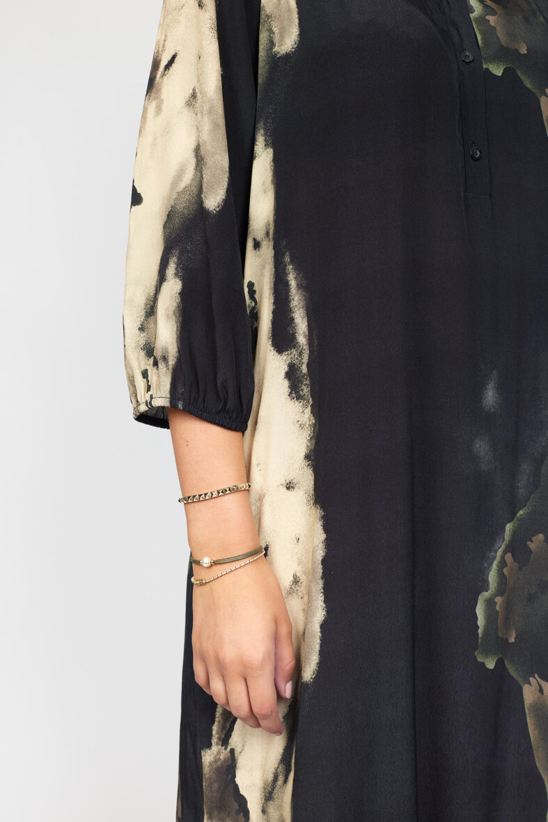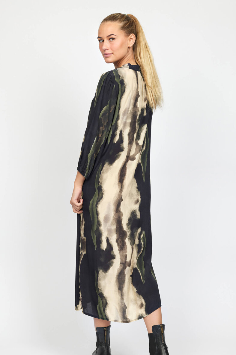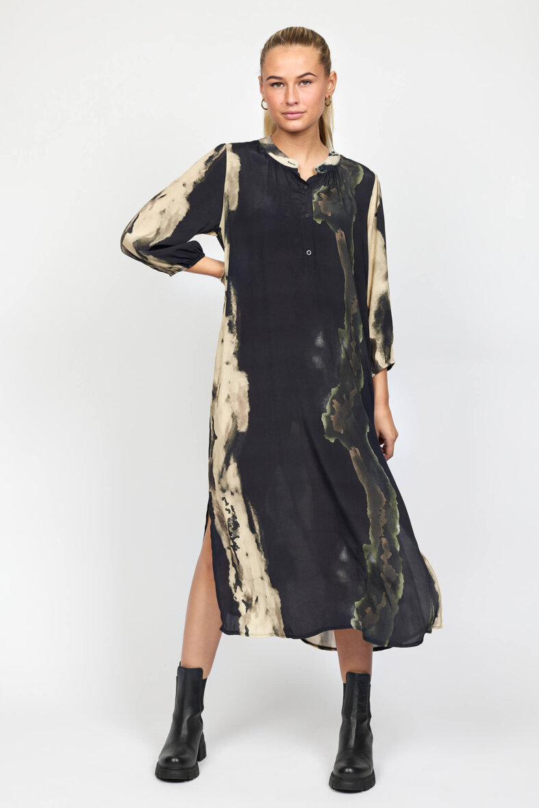 Kjolen er lavet i en lækker 100% viskose kvalitet. Kjolen er med rund hals med stolpeluk og knapper foran. Ærmerne er 3/4 lange med elastikkant forenden, hvilket giver et flot fald i ærmet når man har kjolen på. Kjolen er med en høj slids i siderne.