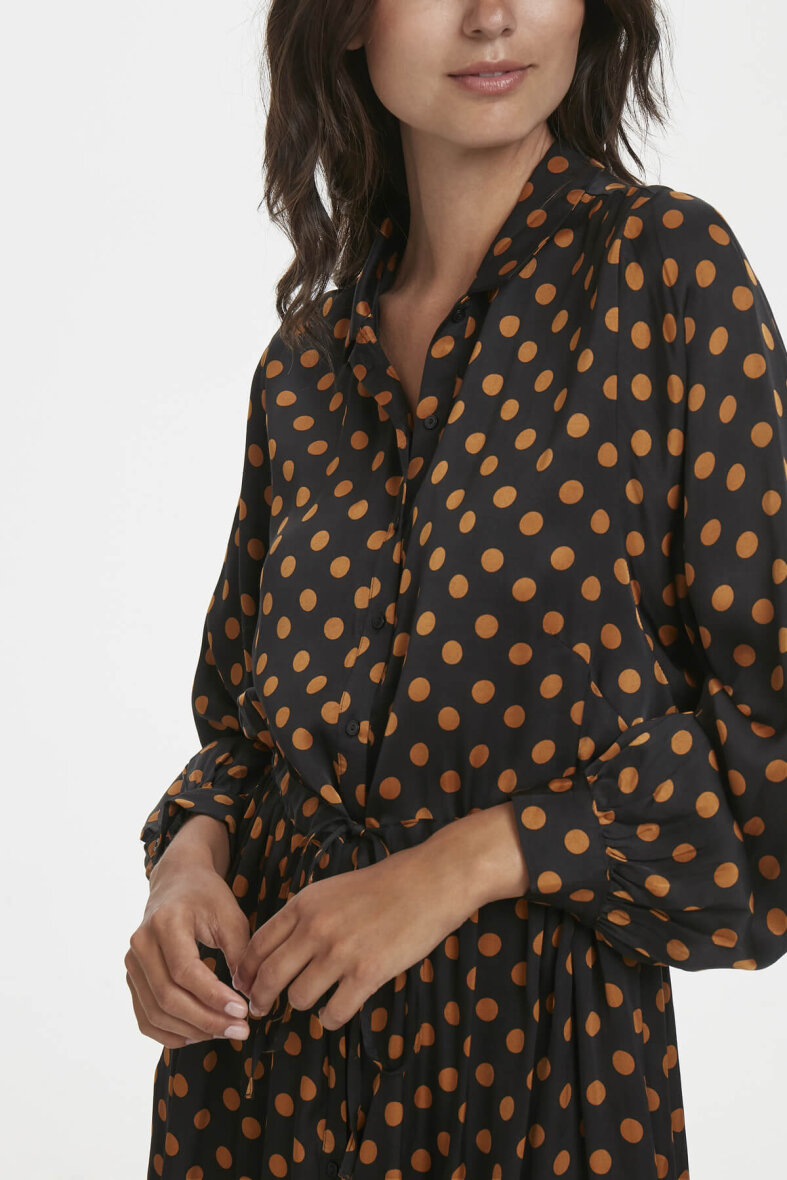 Smuk lang kjole fra Part Two. Den sorte kjole er med et flot prikket mønster med bronze farvet prikker. Kjolen er med krave og gennemgående knapper foran. Kjolen er med en overskæring i taljen med påsyet bindebånd. De lange ærmer er med manchetluk.