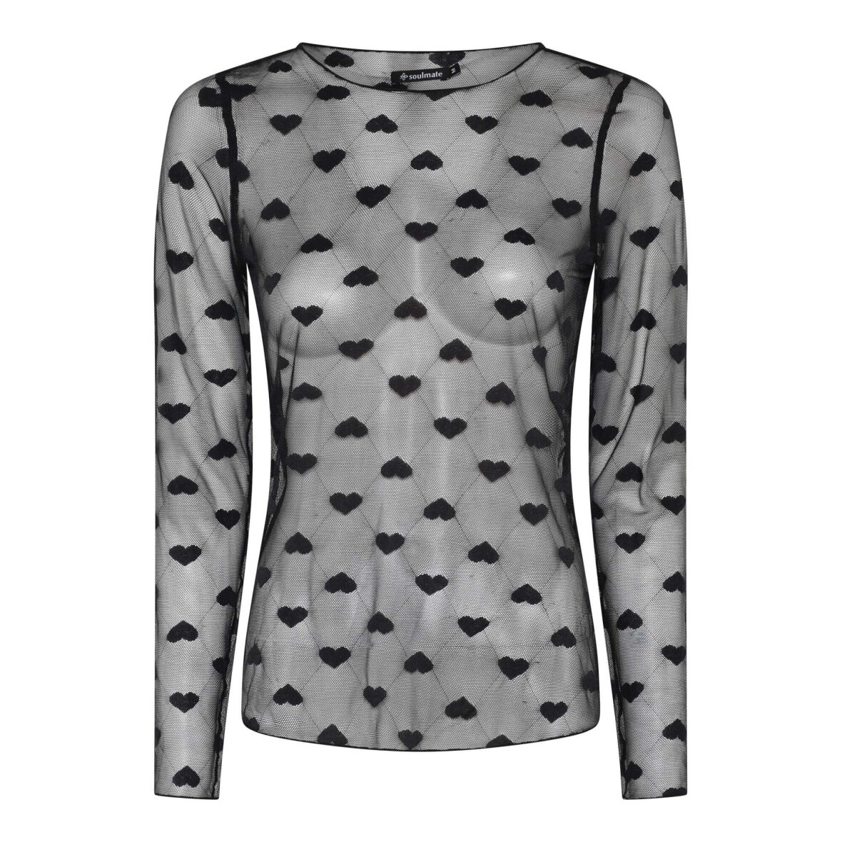 Skøn sort mesh bluse fra Soulmate i et flot mønster med hjerter, hvilket giver et feminint udtryk. Blusen er transparant med rund hals og lange ærmer.