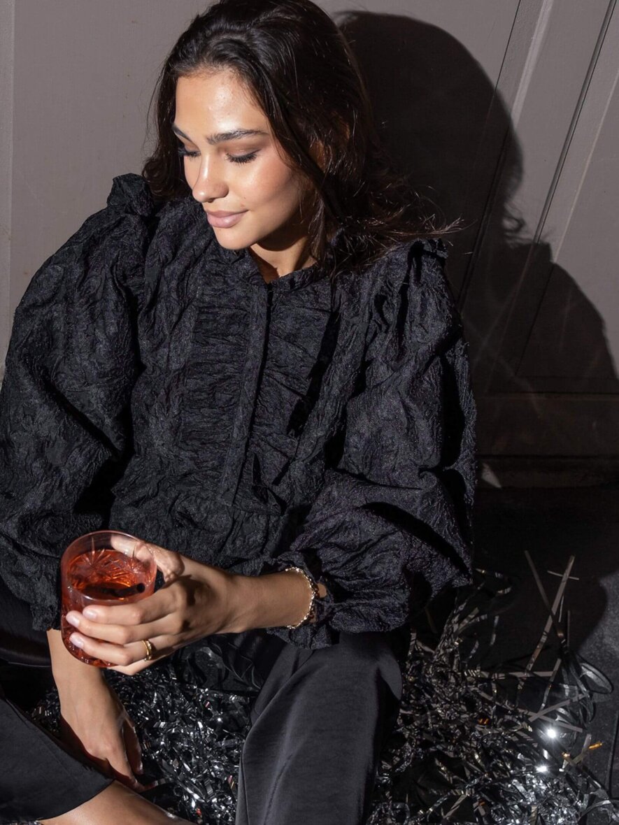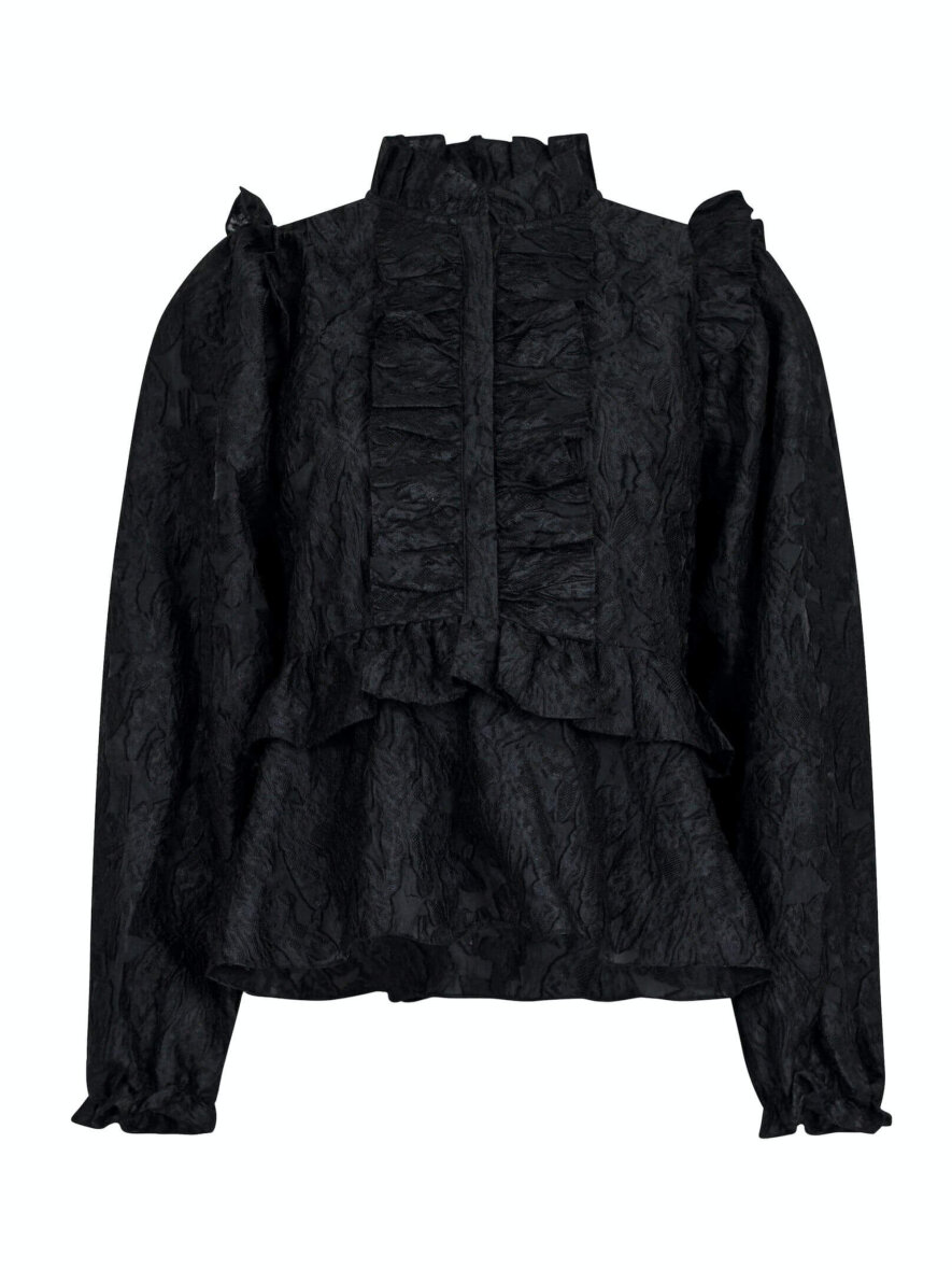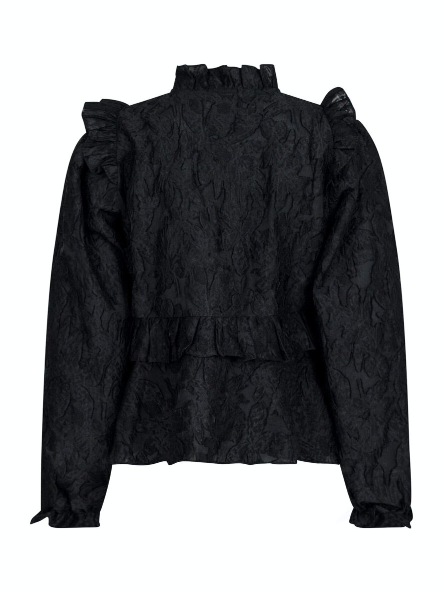 Smuk sort bluse med masser af fine flæse detaljer fra Neo Noir. Hawaii Flower blusen er med struktur i materialet med giver et feminint udtryk med de flotte flæse detaljer på blusen. Blusen er med rund hals med høje flæser, stolpeluk med skjulte knapper foran samt et flot flæse stykke. Blusen er med puf ved skuldrene og flæse detalje samt lange ballon ærmer med elastikkant ved håndleddet. Blusen er med en fin flæse kant ved overskæringen på midten af blusen.