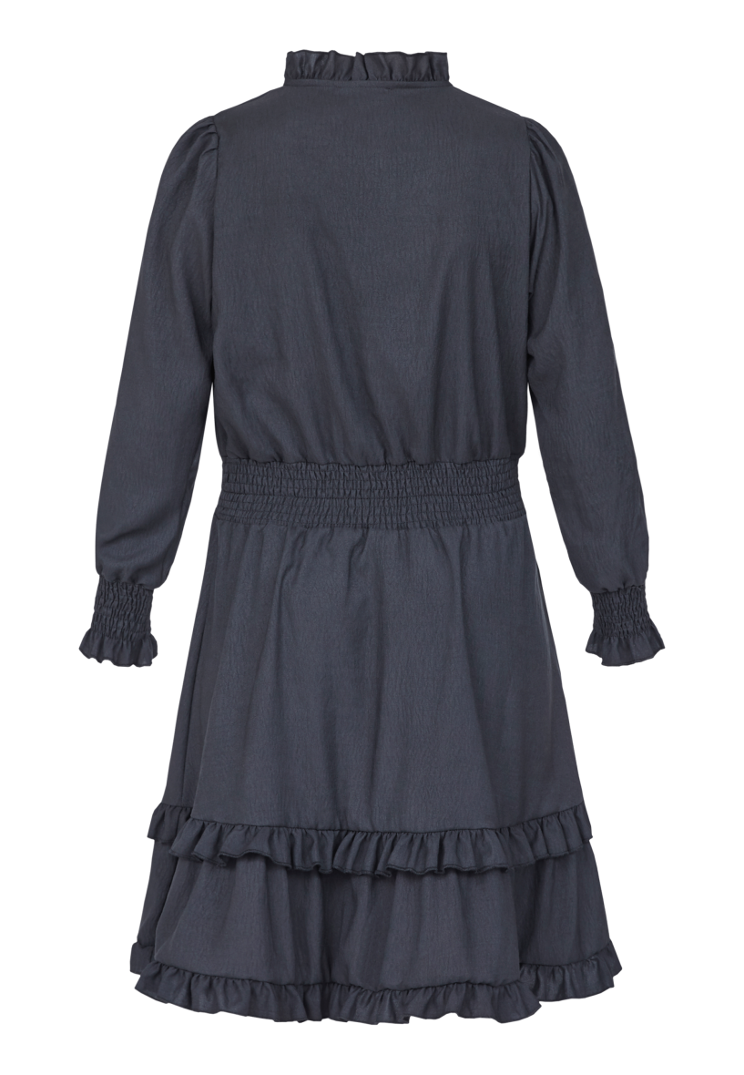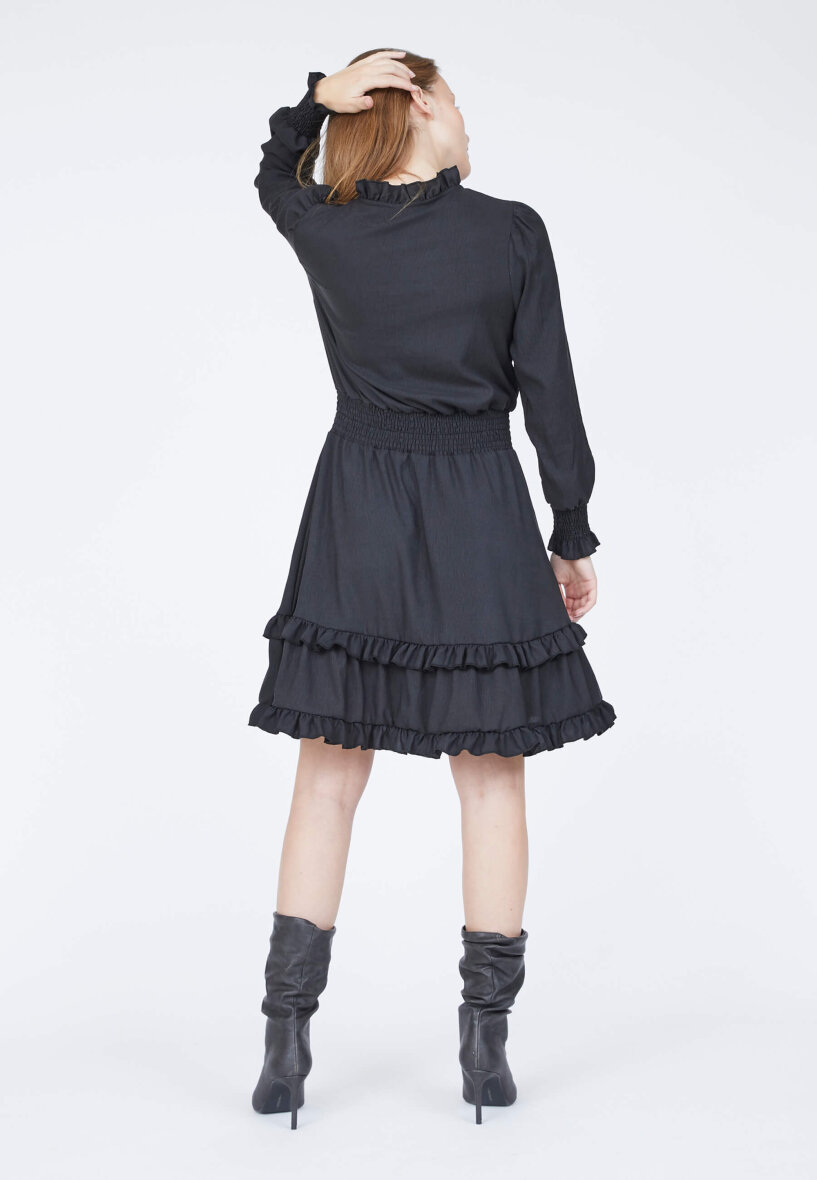 Kjolen er med et bredt smock stykke i taljen, hvilket gør at den sidder flot til i taljen og giver en flot figur. Kjolens lange er med smock kant og flæse detalje. Den nederste del af kjolen afsluttes med dobbelt flæse detalje, hvilket giver et flot og feminint udtryk. MOLIA kjolen kan bruges til mange forskellige anledninger. Style evt. med et par smarte støvler.