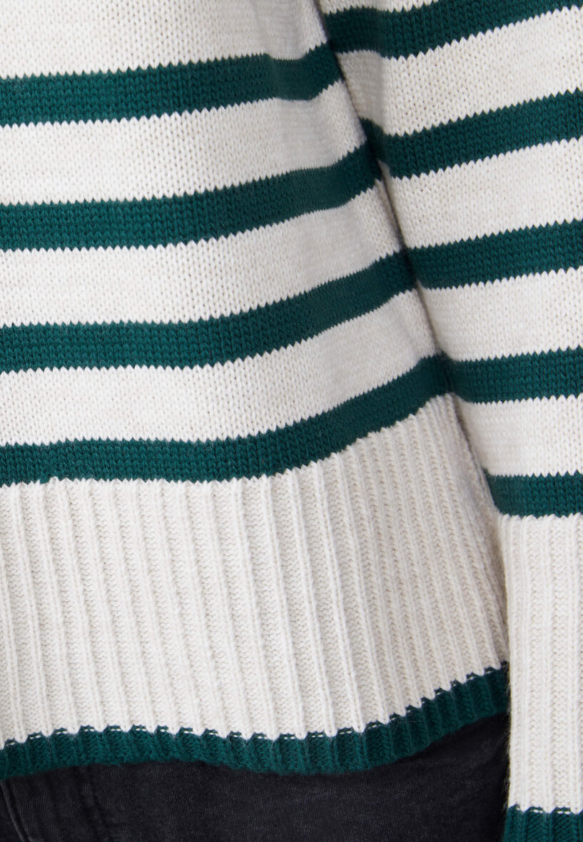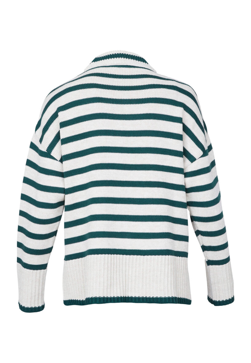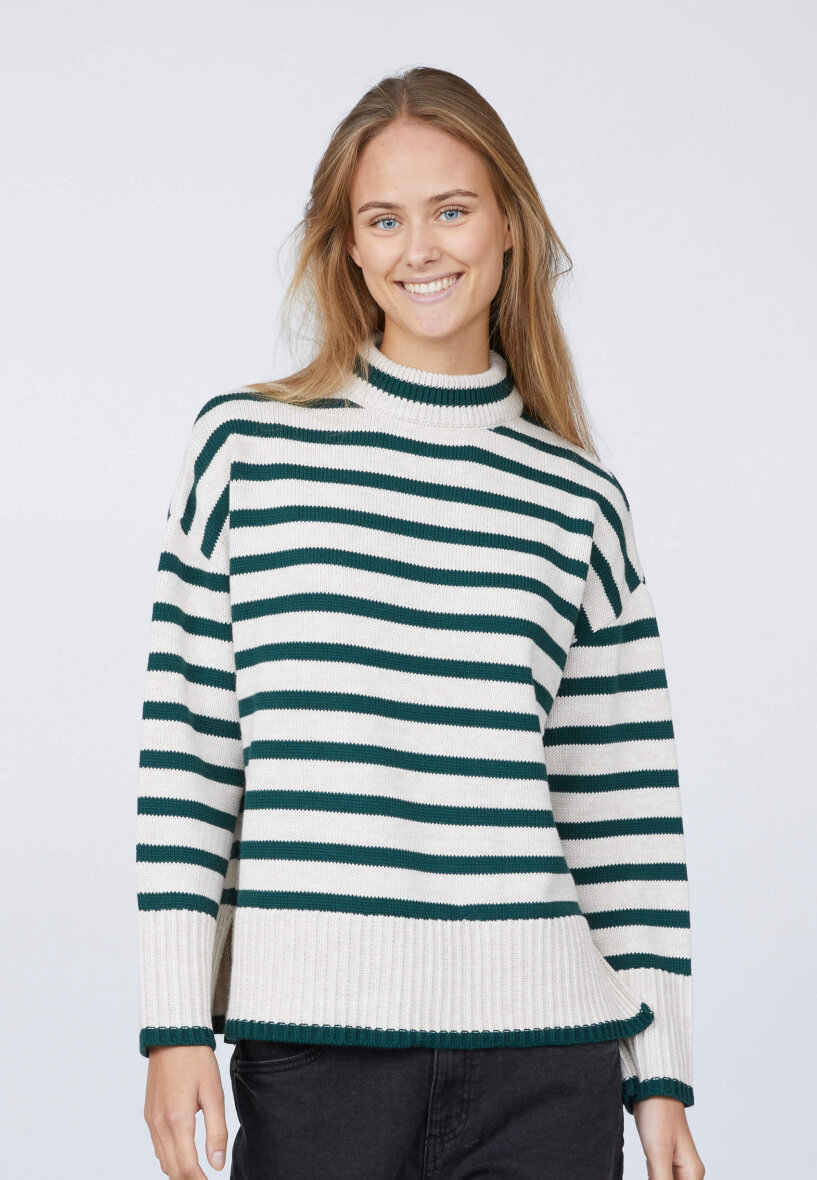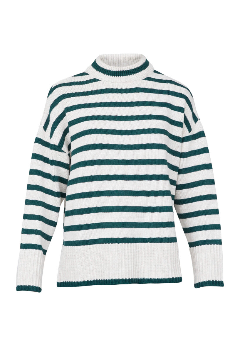 Lækker, kraftig striktrøje fra Sisters Point. Strikken er lavet i et flot stribet design med grønne striber på off-white baggrund. Striktrøjen er med høj rund hals, lange ærmer og ribkant ved alle åbninger. Trøjen er med slids i siderne.