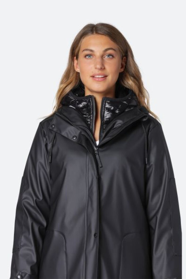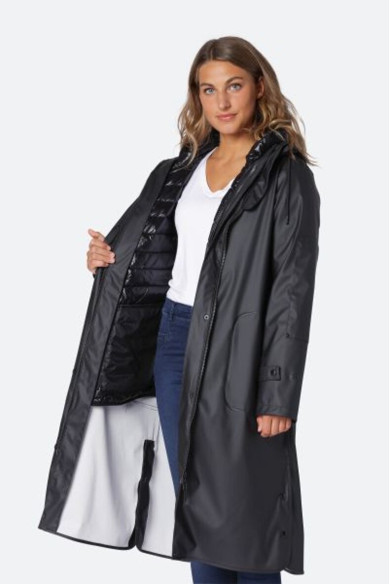 Lækker 3 i 1 jakke fra Ilse Jacobsen. En multifunktionel jakke som kan bruges til hele året. Under den lange regnjakke er en termojakke, som kan lynes af, så den kan bruges for sig selv.