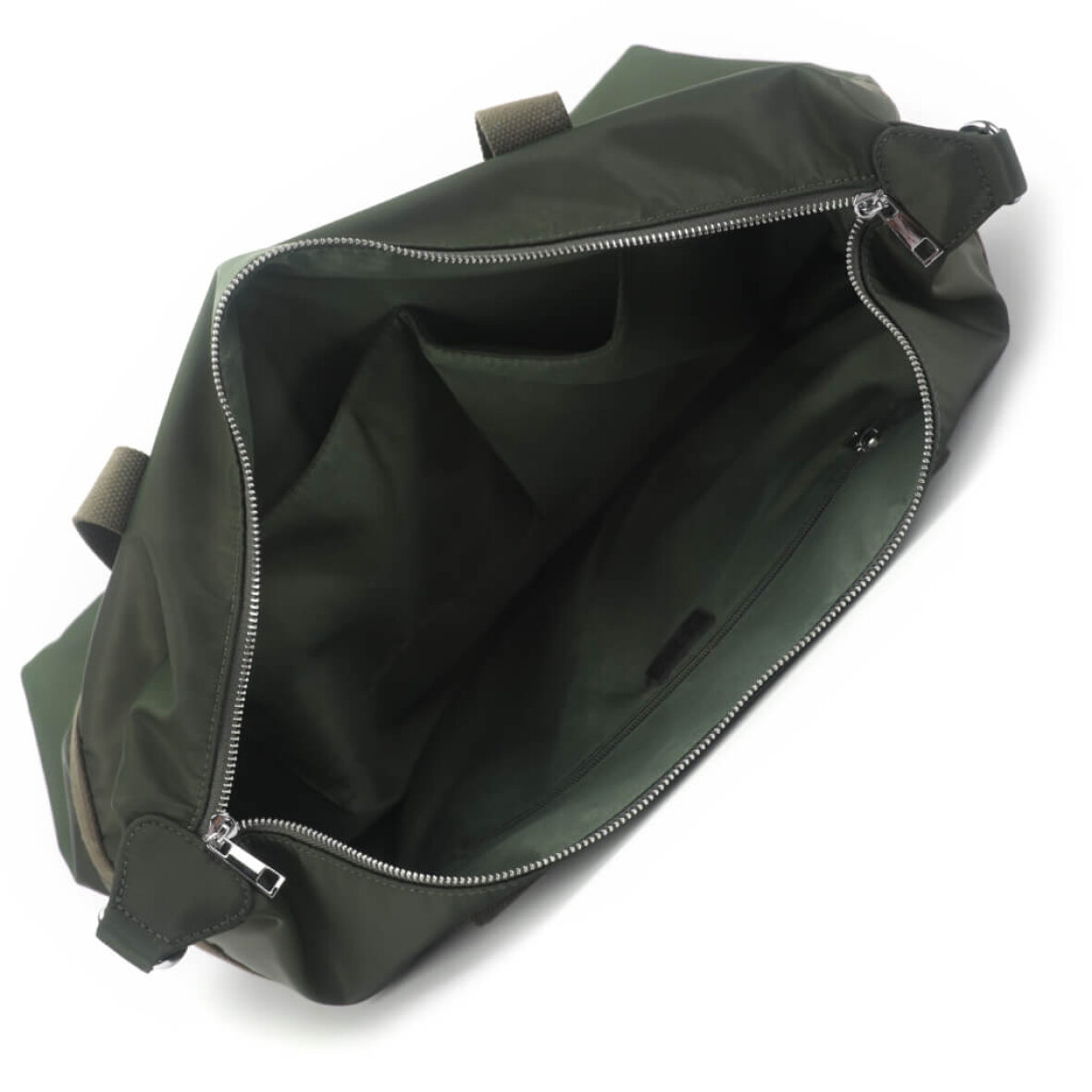 Weekendtasken er med god rummelighed med et stort åbent rum. Derudover er der en lynlås lomme inderst i den ene side og to stiklommer i modsatte side.
