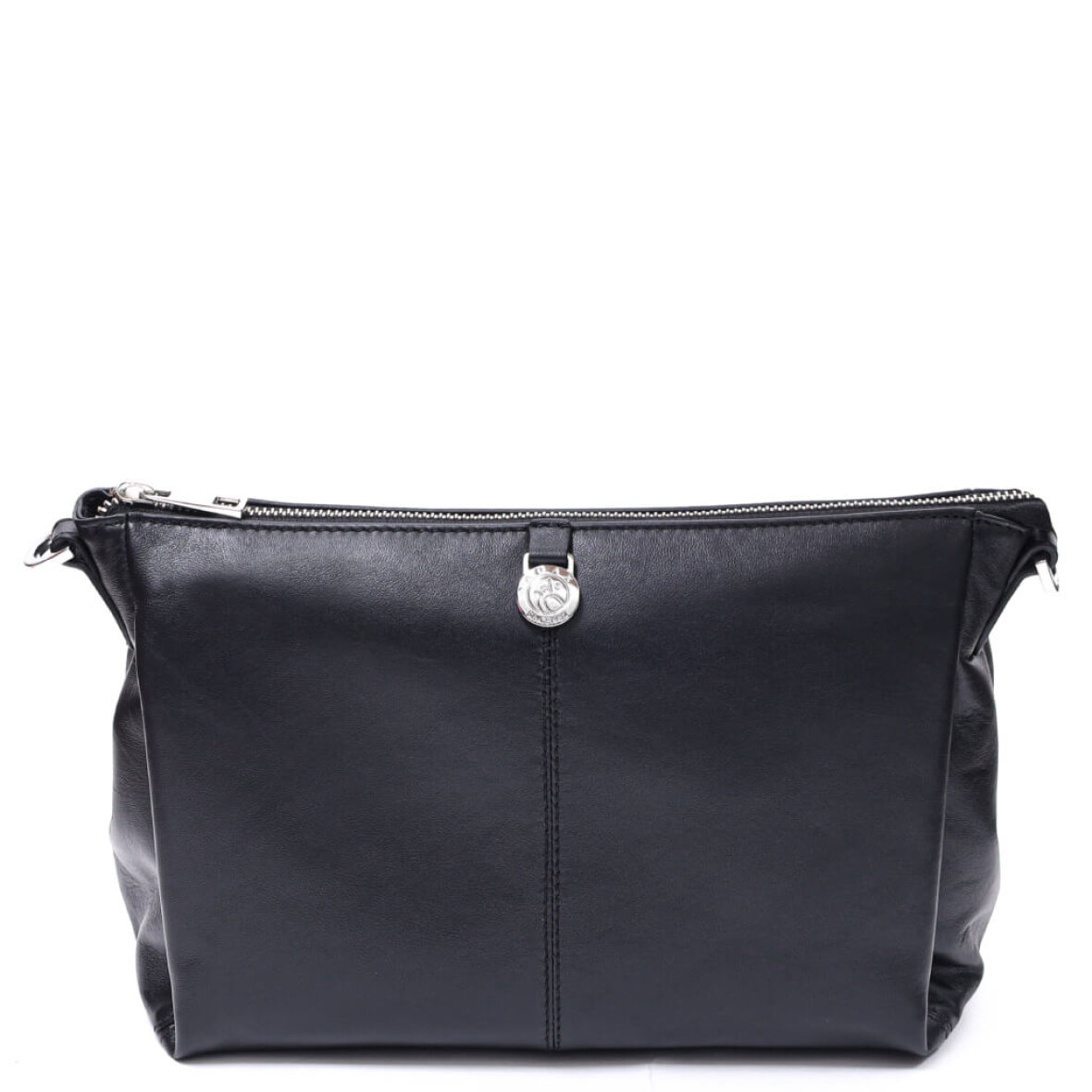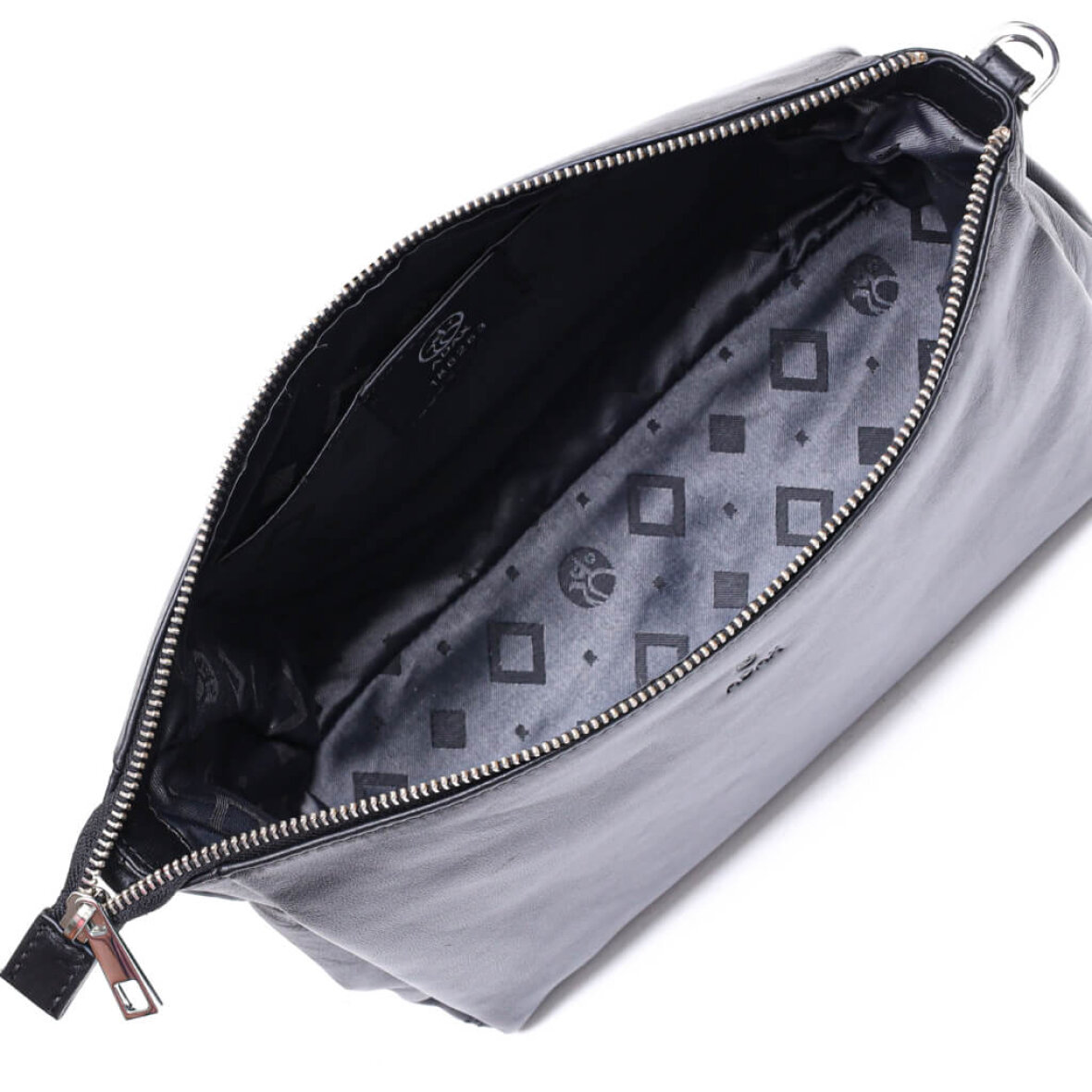 Tasken består af et åbent rum som åbnes med lynlås. Indvendig er tasken med med en lynlås lomme og stiklommer på modsatte side, til de vigtigste småting.