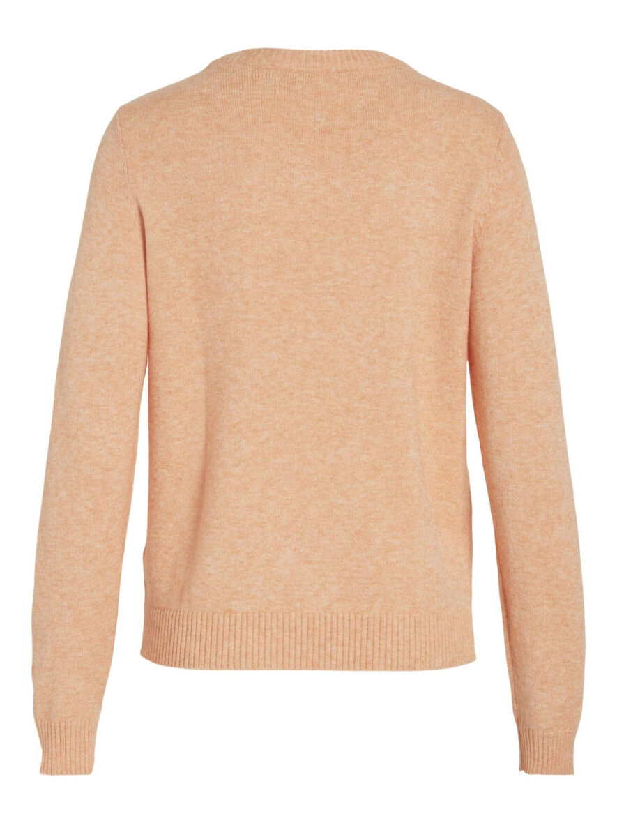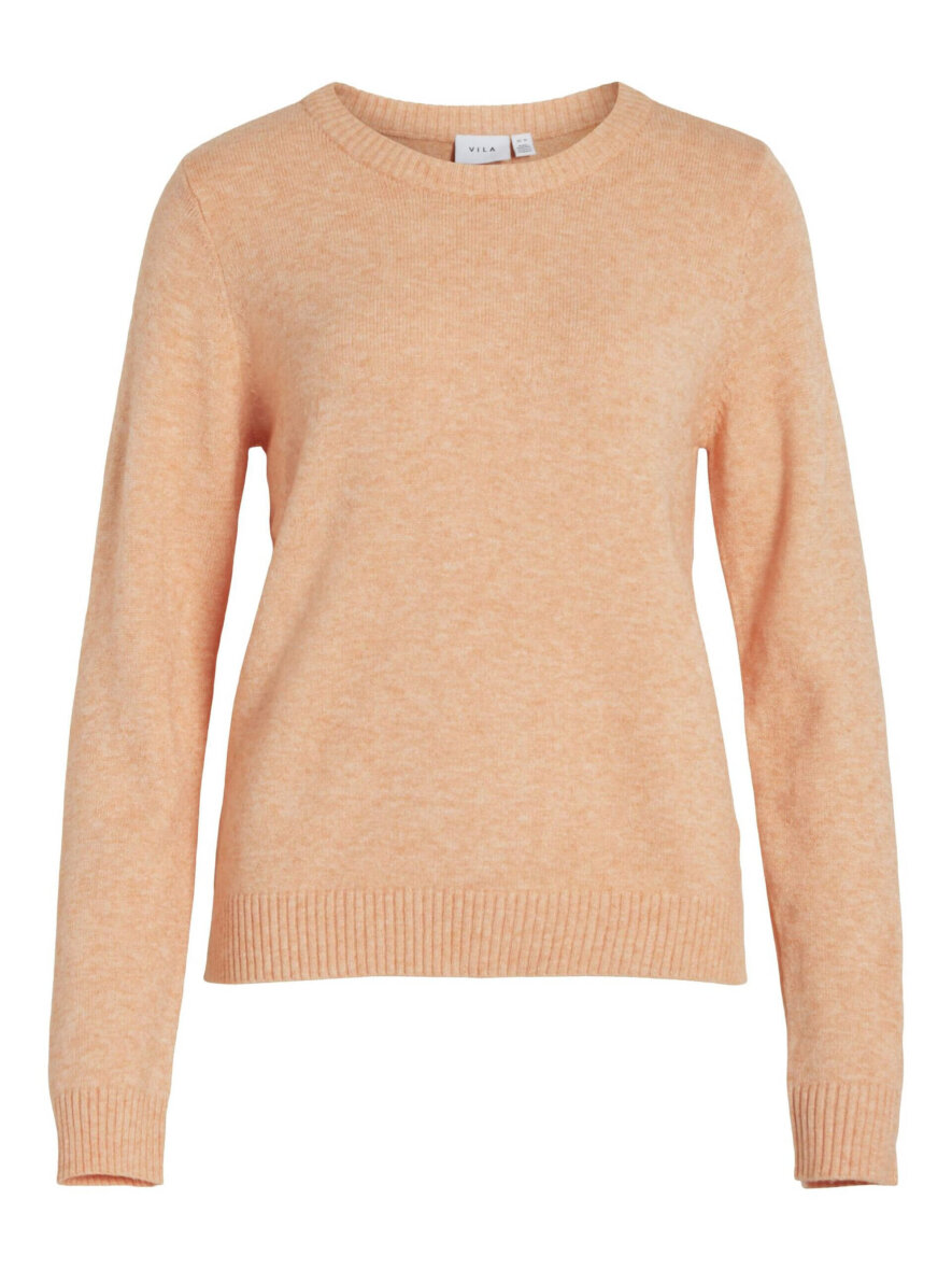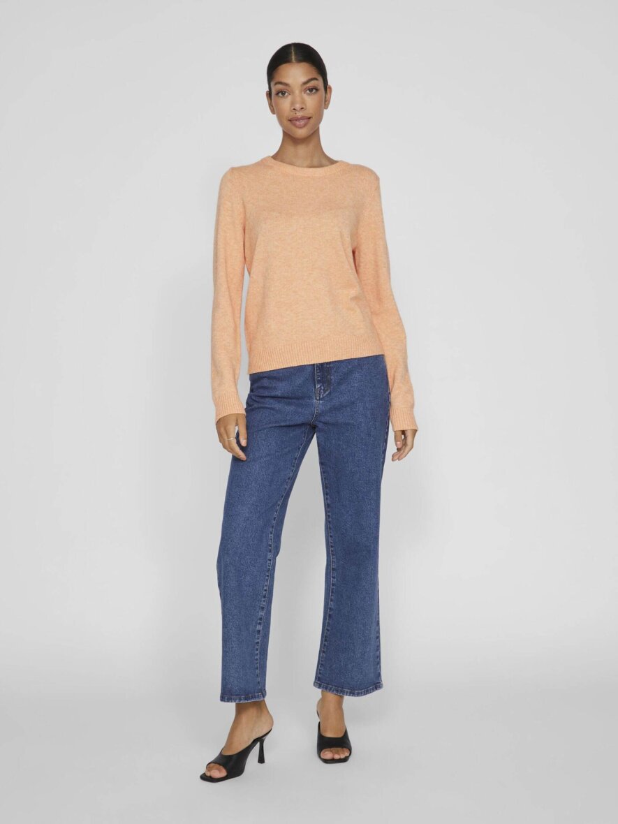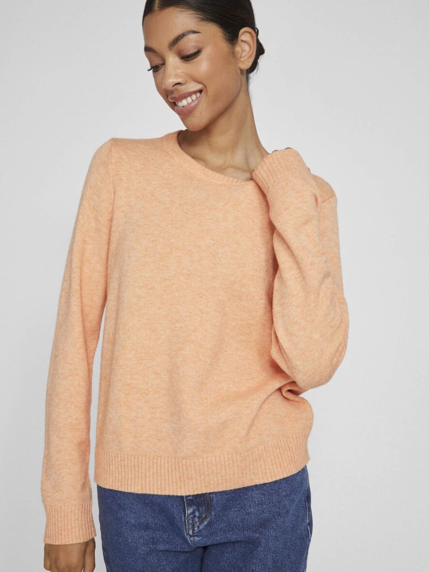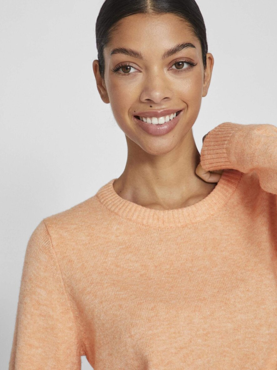 Dejlig blød striktrøje i en flot orange farve fra VILA. Striktrøjen er med rund halsudskæring med ribkant ved halsen, ærmerne samt bunden af blusen.