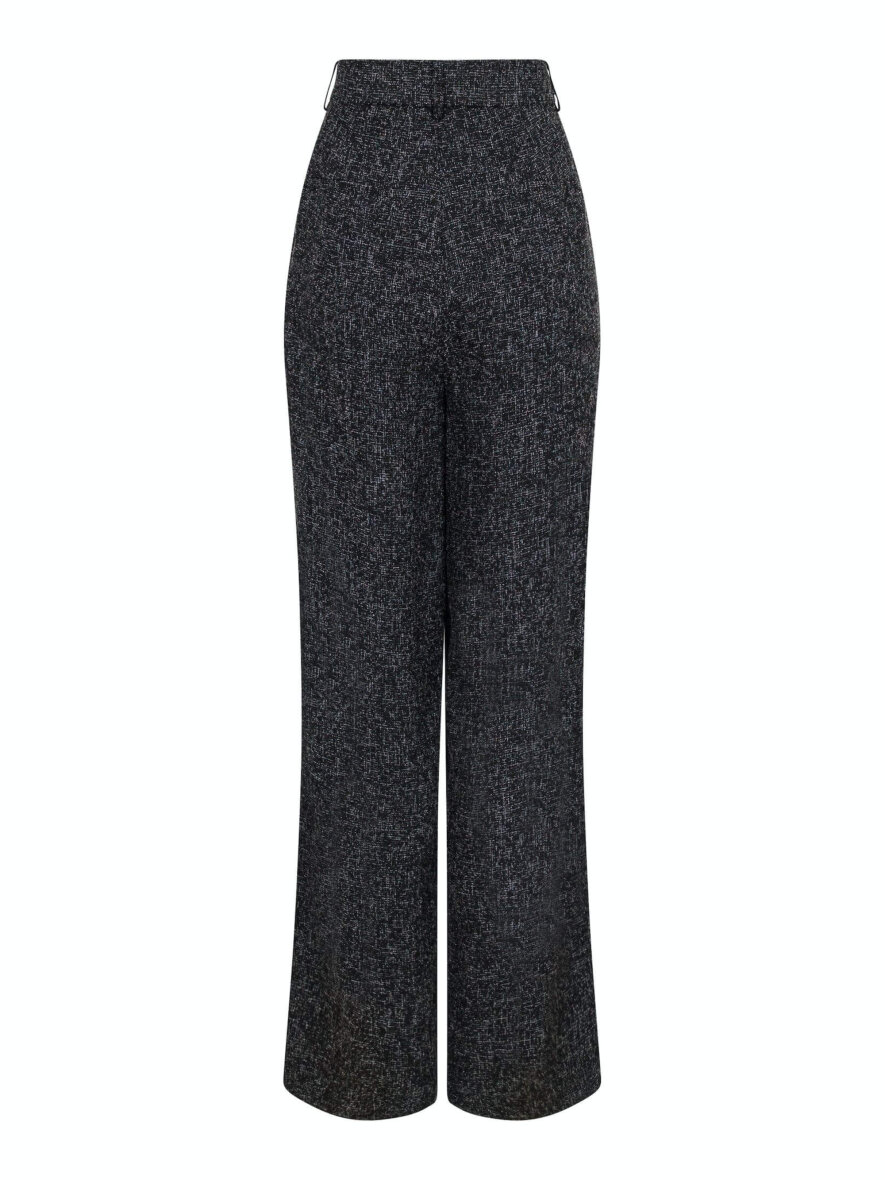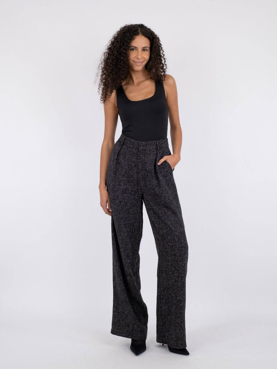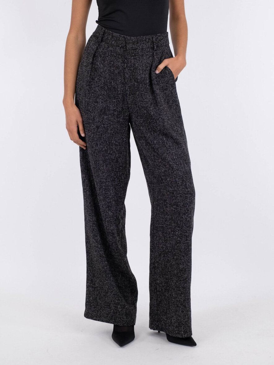 Smarte Alessanda bukser fra Neo Noir i en sort/hvid farve. Bukserne er lavet i en lækker polyester kvalitet med et flot melange look. Buksen er med høj talje med vidde og brede ben. Bukserne lukkes med lynlås og hægte foran. Med bæltestropper og pyntlommer bagpå og skrålommer foran. Style evt. med habit jakke eller vest for et smart og sofistikeret look.