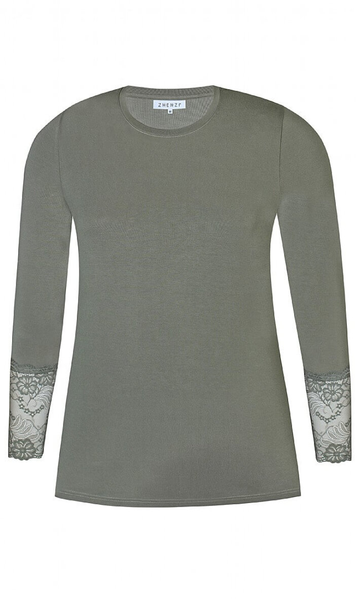 Flot og enkel bluse i en flot army grøn farve fra Zhenzi. Blusen er lavet i et simpelt design med rund hals og lange ærmer. Som en fin og feminin detalje er blusen med et bredt blonde stykke nederst ved ærmet.