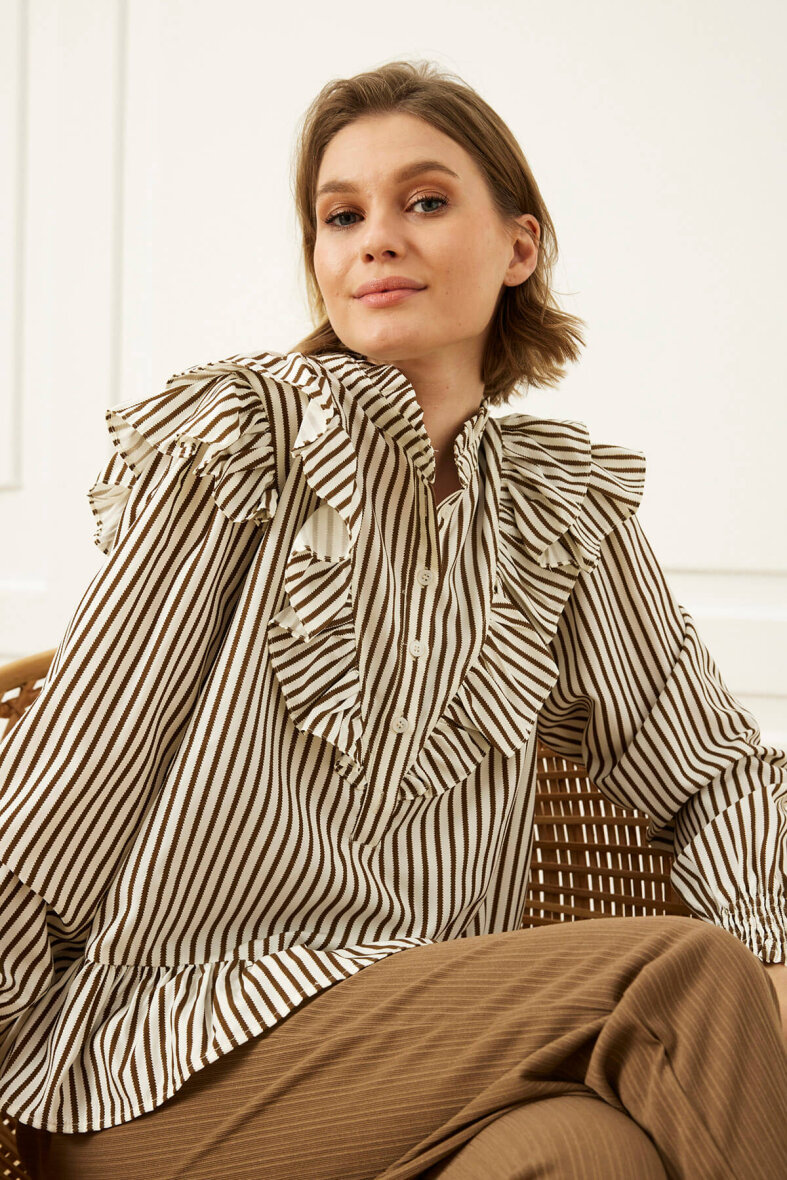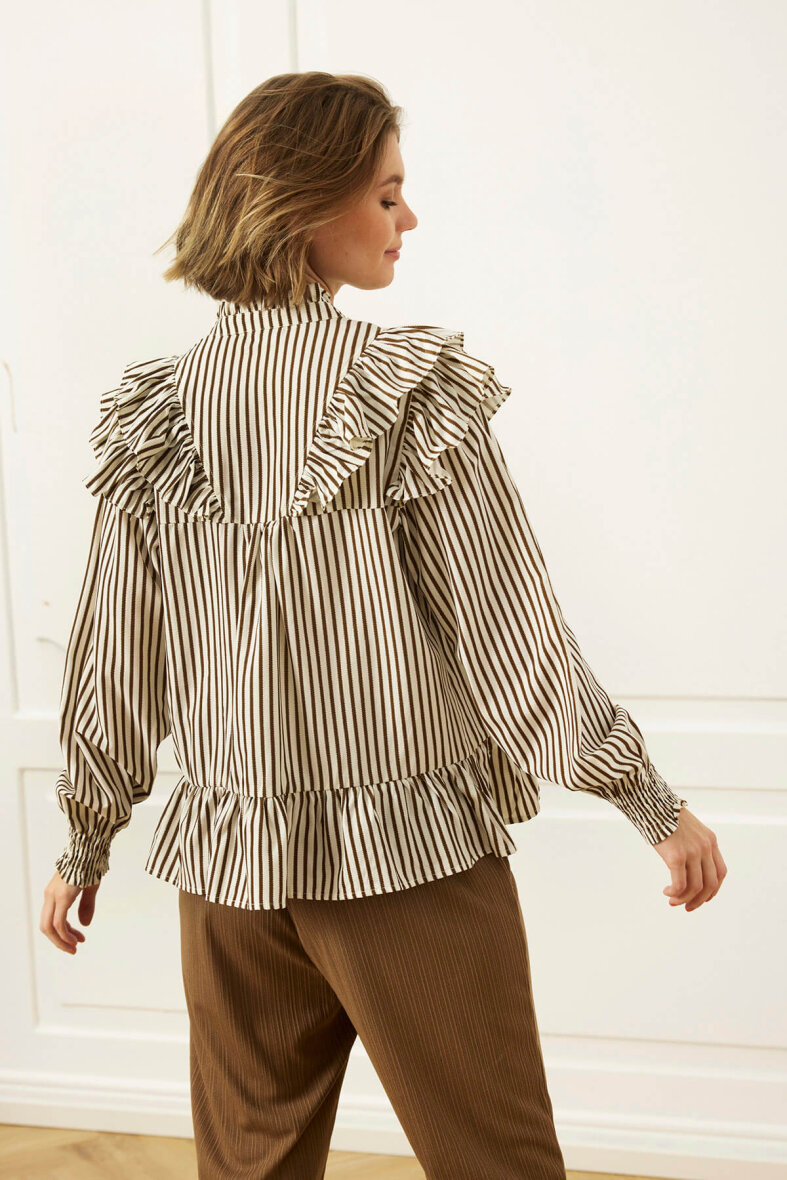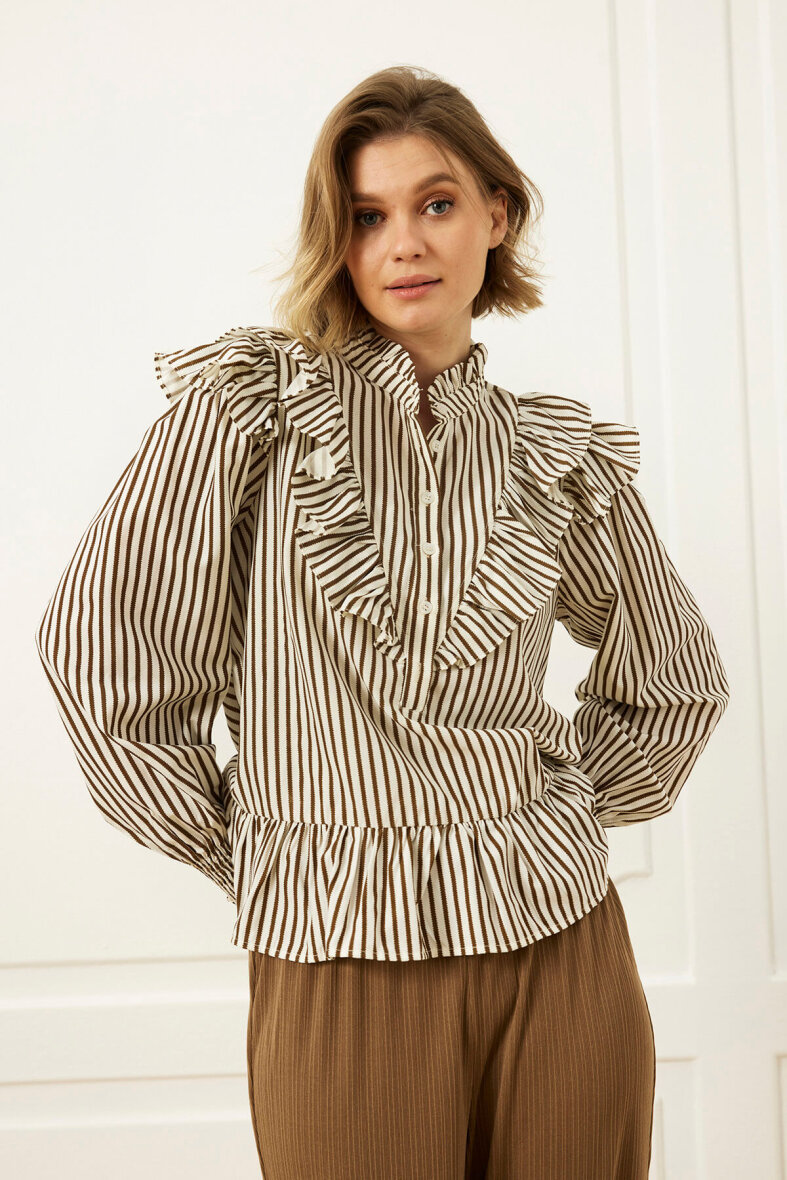 Blusen er med rund hals med en fin flæse detalje langs hals åbningen. Blusen er med stolpeluk og knapper langs fronten.