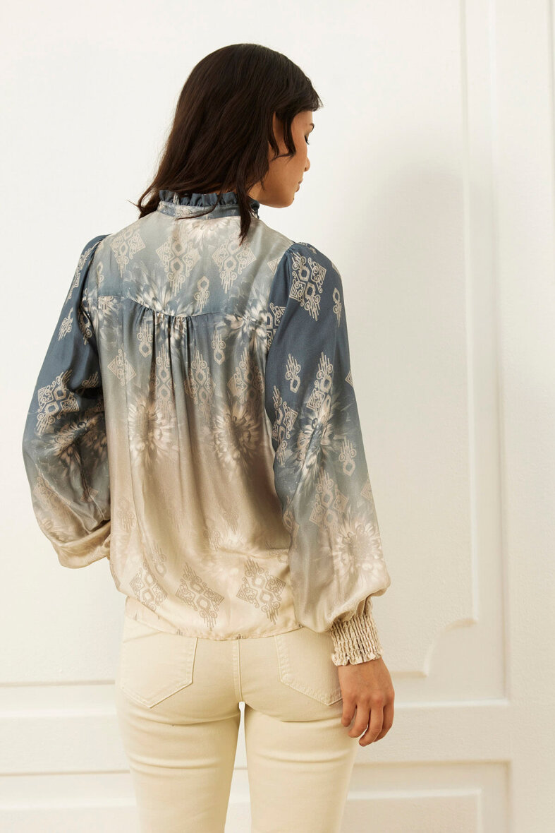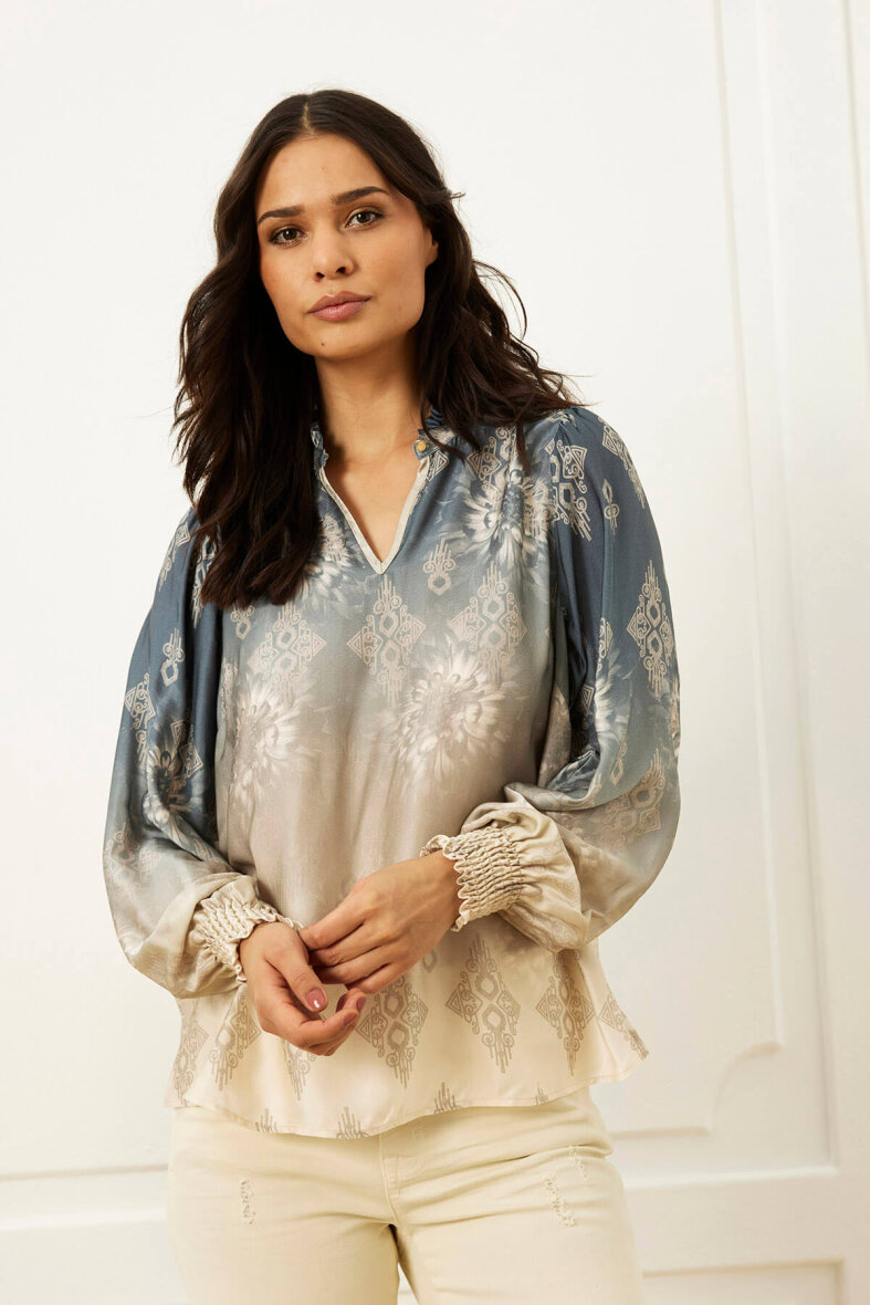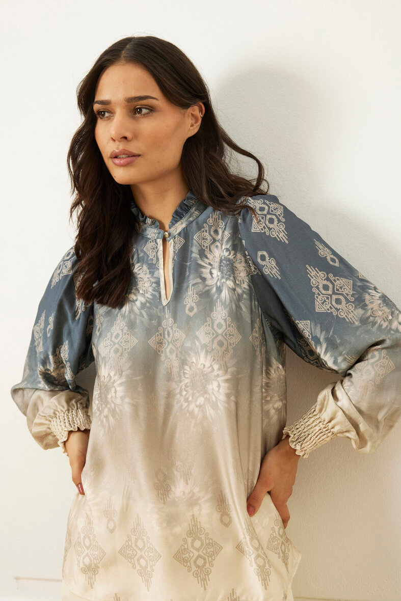 Smuk bluse fra IN FRONT. Blusen er lavet i et smukt ombre effekt som fader ud fra blå til sandfarvet. Blusen er tilmed med et flot print med mønstre og blomster.