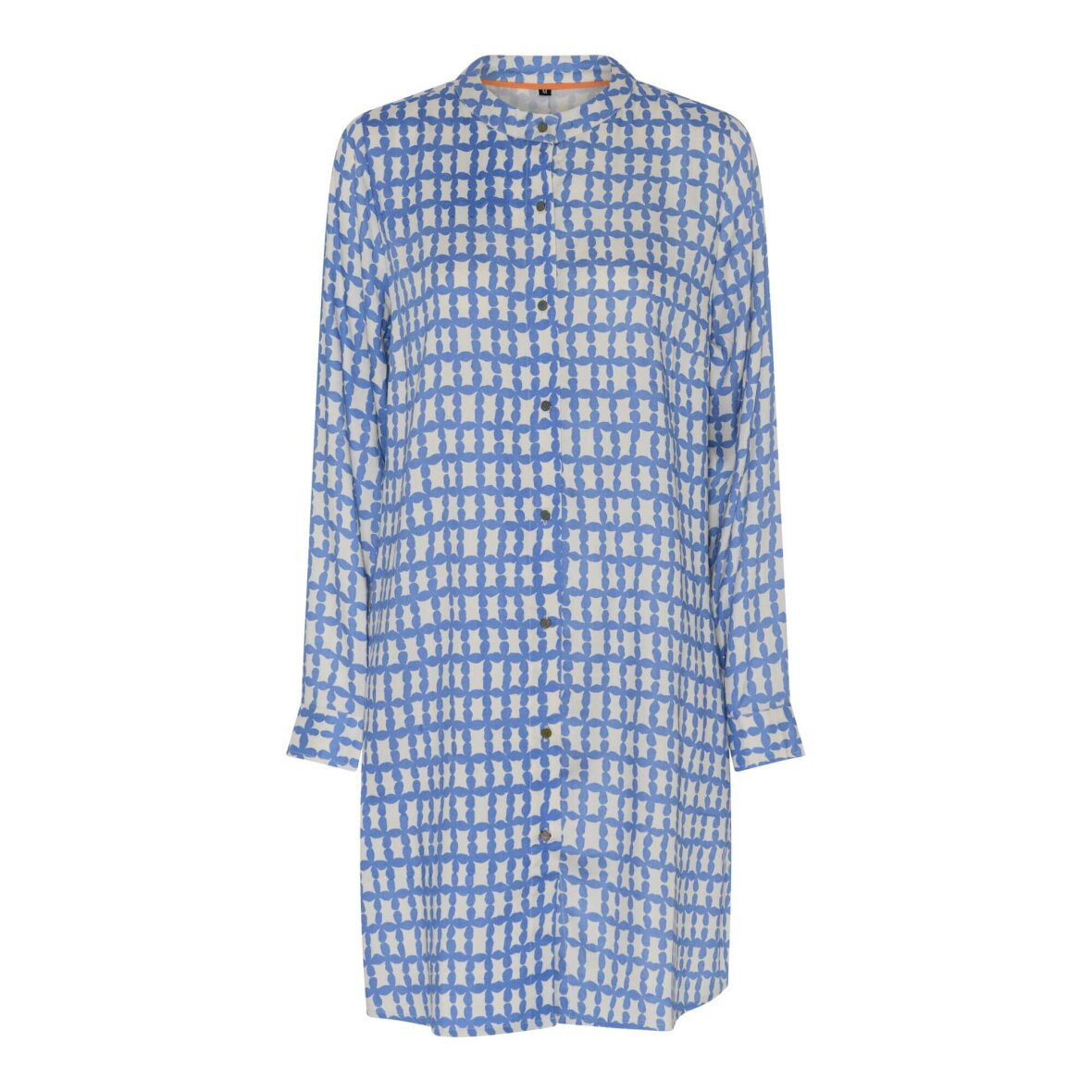 Flot lang tunika fra Soulmate. Ina kjolen er lavet i et flot hvid/blå all-over mønster. Tunikaen er med rund hals og gennemgående knapper langs fronten. Tunikaens lange ærmer afsluttes med manchetknap.