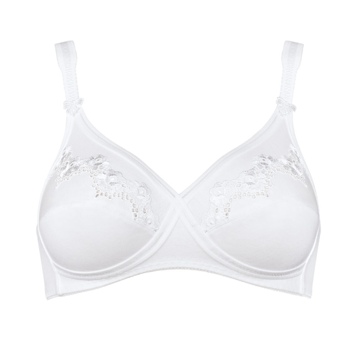 Full Cup Bh med feminint udtryk med blomster fra Triumph Elasti Cross + Cotton N uden bøjle og fyld. Det er en lækker blød model, som giver et fint løft til barmen. Flotte blomster på skålene.