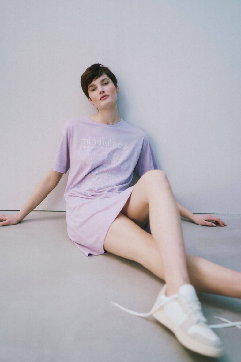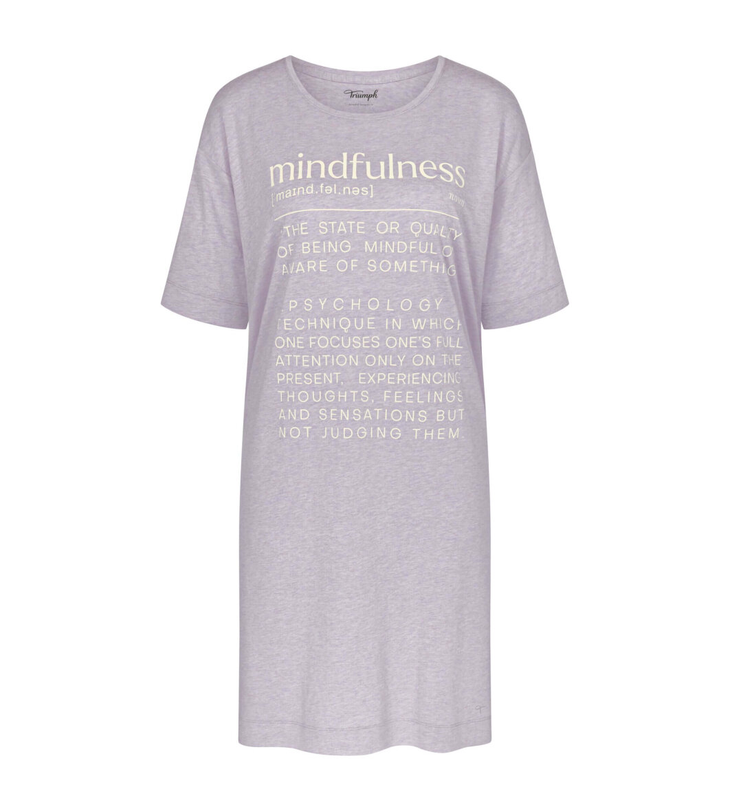 Flot lilla natkjole fra Triumph. Natkjolen er med tryk på fronten af ordet "Mindfulness", med beskrivelse som i en ordbog.