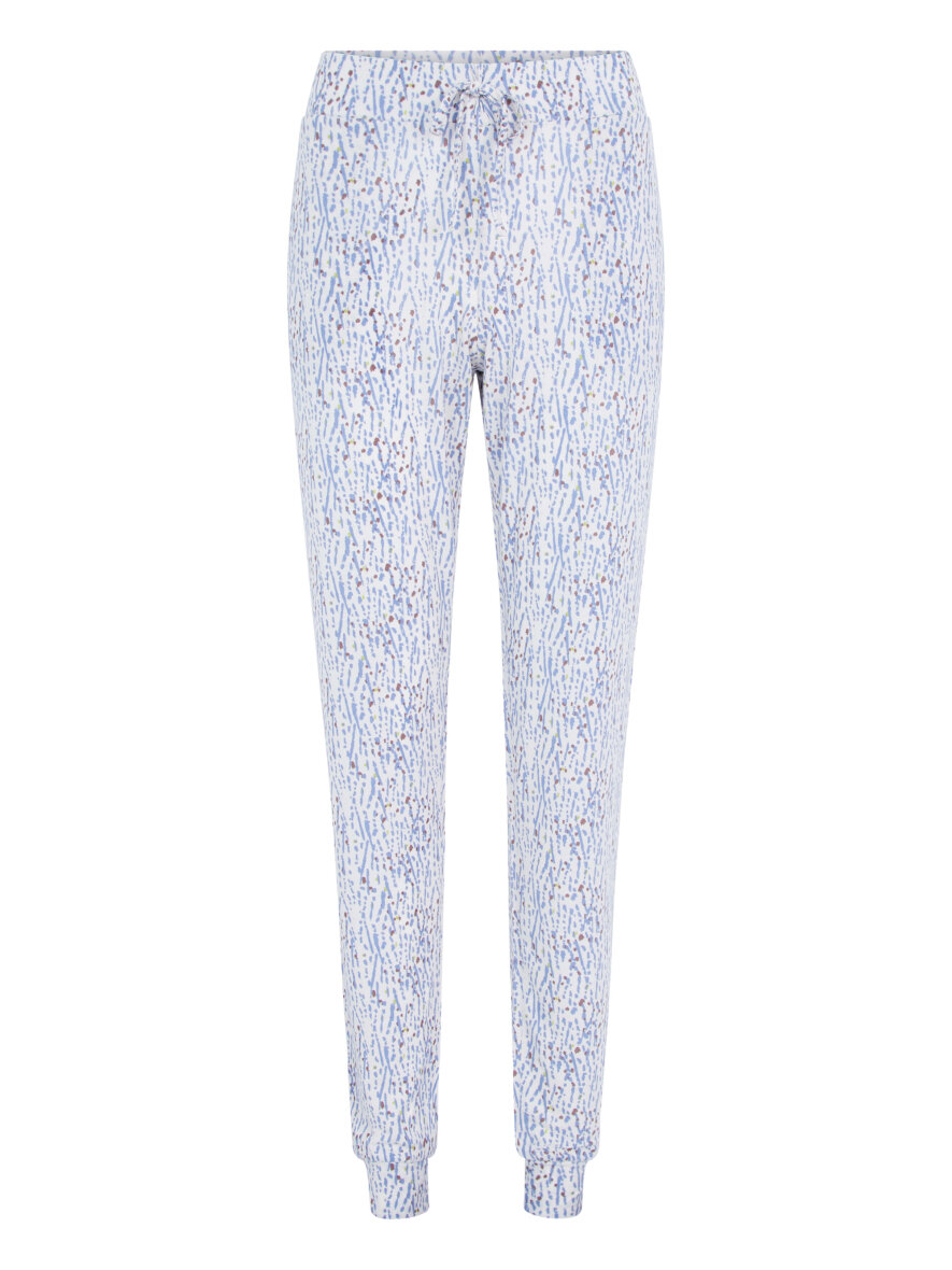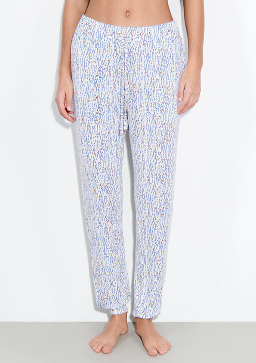 Buksen er lavet i et skønt print i matchende blå toner som blusen. Buksen er med elastik i taljen samt bindebånd. Buksen er med kant ved anklen, så den sidder godt til og danner en let poset effekt.