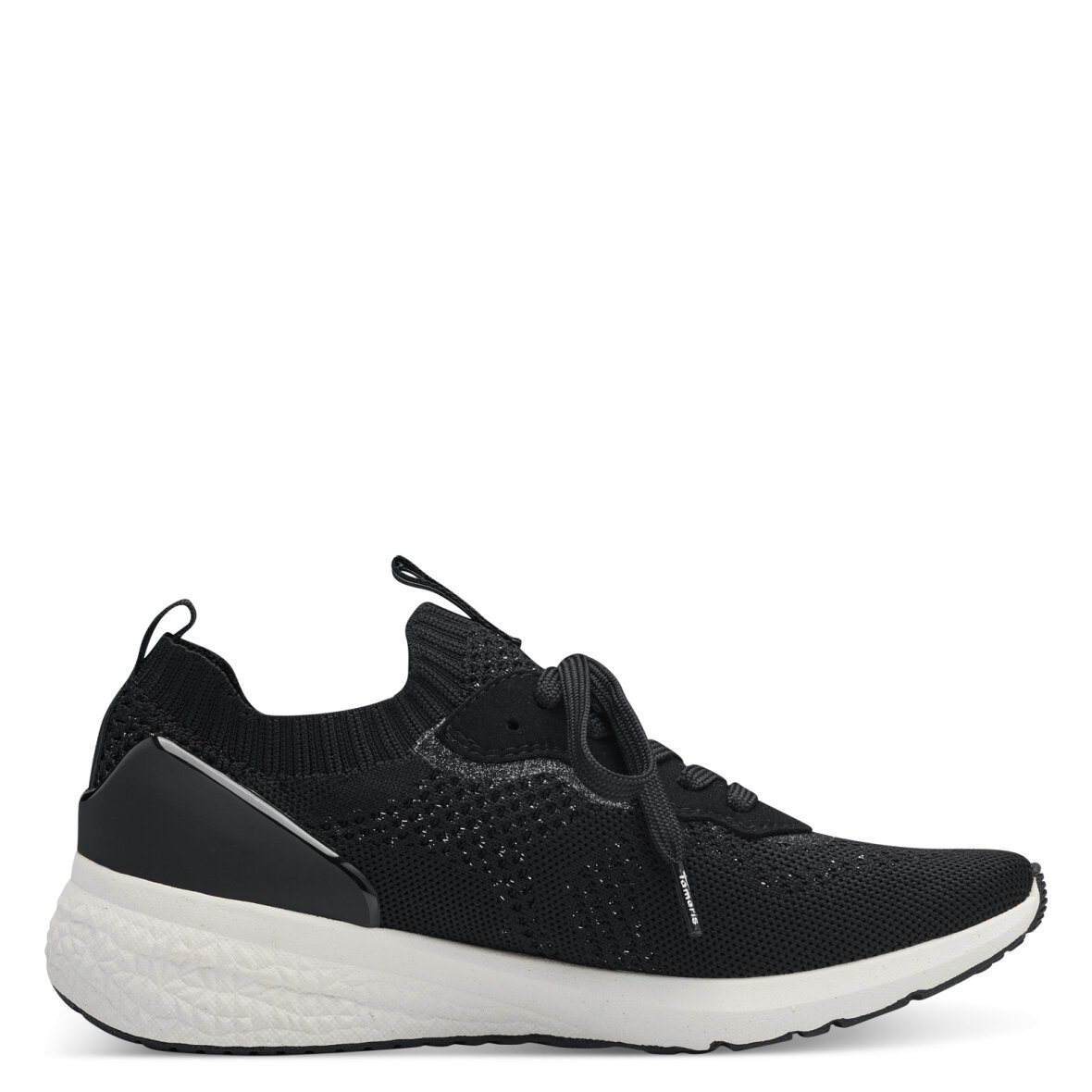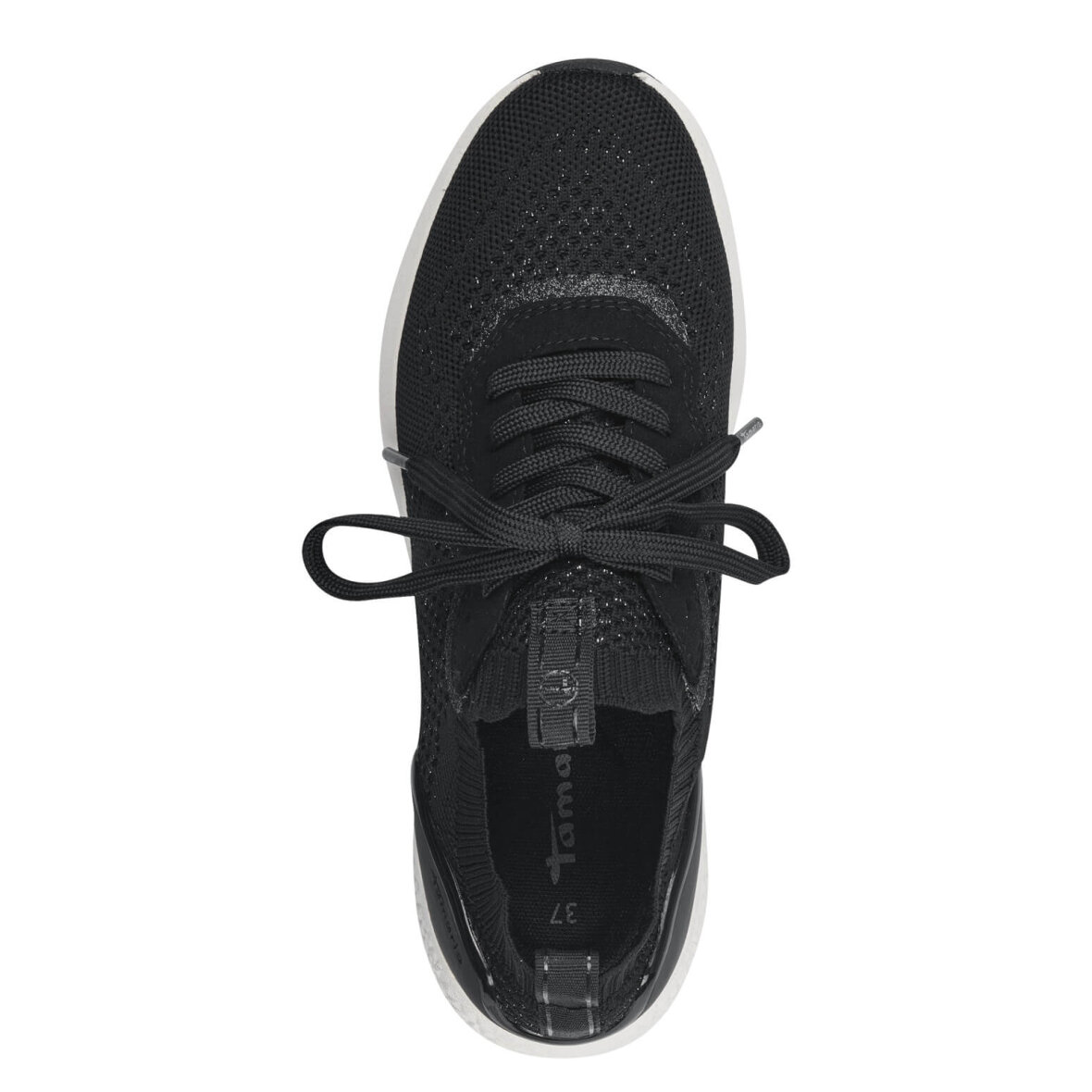 Lette og fleksible sneakers fra Tamaris. Den klassiske sorte sneaker er med glimmertråde i overdelen, hvilket giver et let shine. Samtidig er skoen også med et imiteret skind stykke langs snørebåndsåbningen som er med shine effekt.