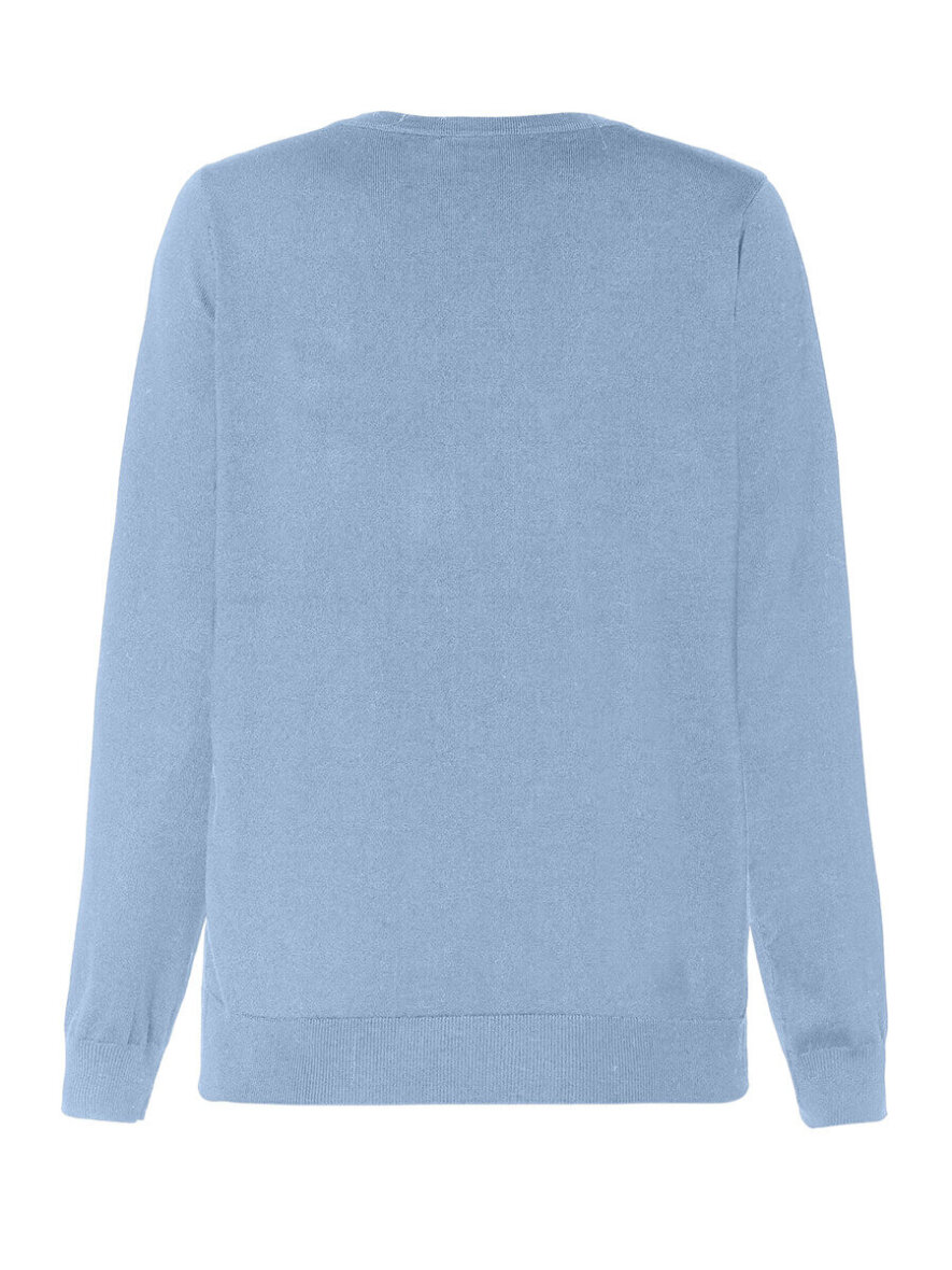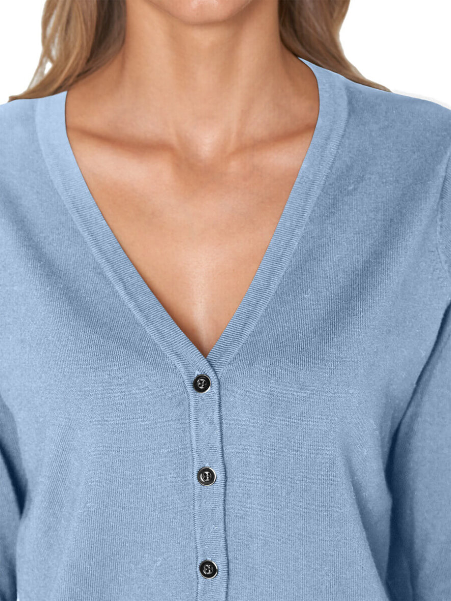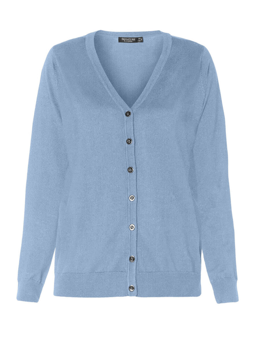 Flot strikket cardigan fra Signature i en fin lyseblå farve. Cardiganen er med v-halsudskæring og gennemgående knapper langs fronten. Cardiganen er med ribkant ved alle åbninger.