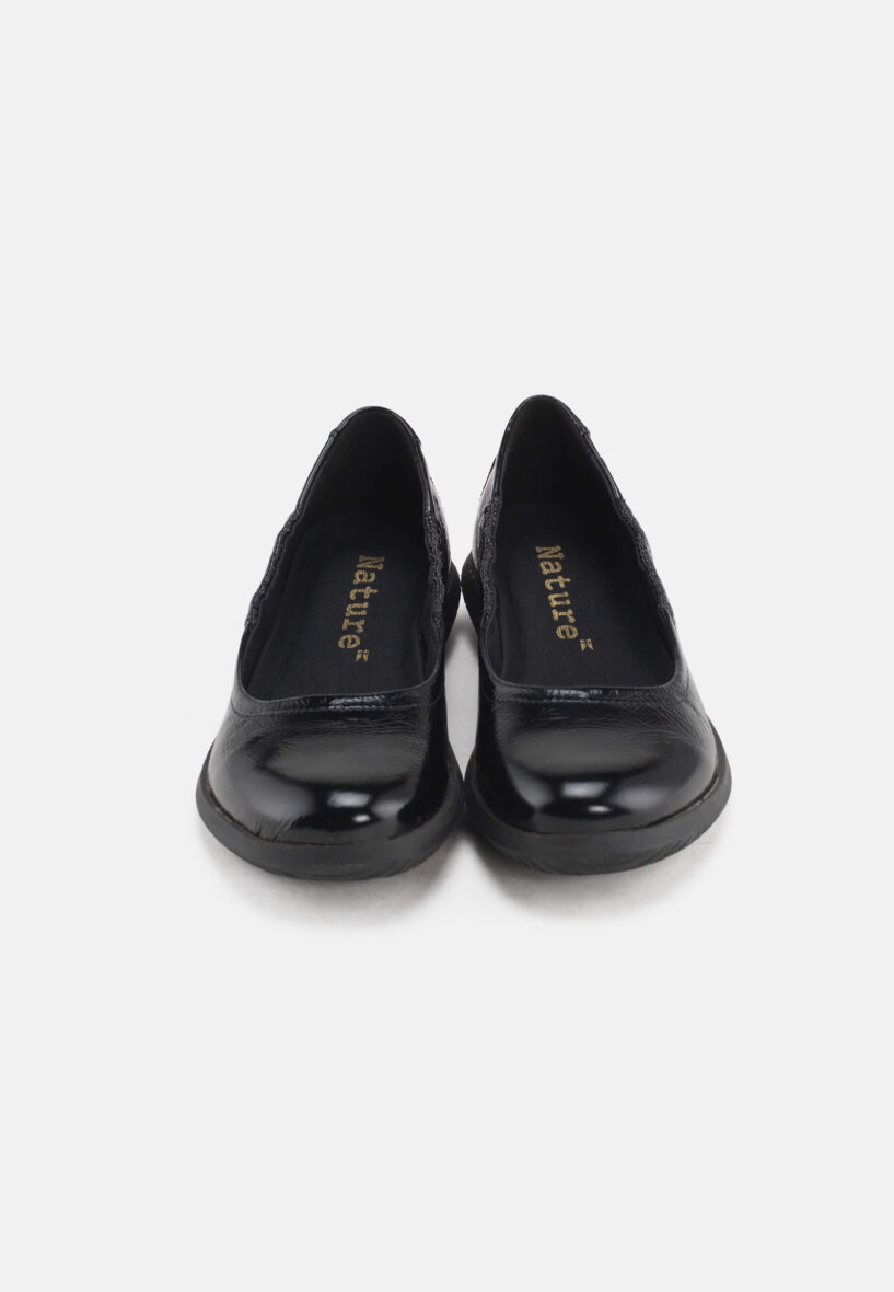 De skønneste ballerina sko i modellen Marie fra Nature Footwear. Skoen er lavet i sort skind med lak look med matchende sorte ydersål i naturgummi.