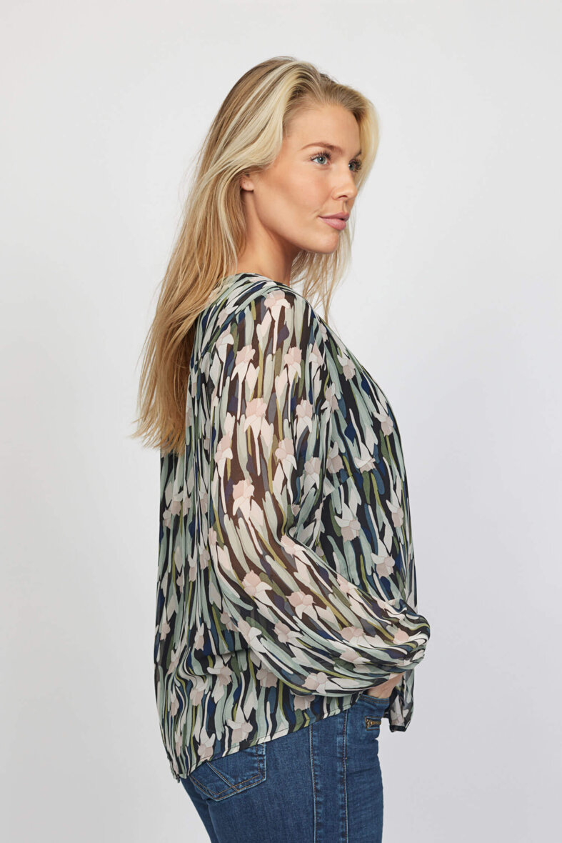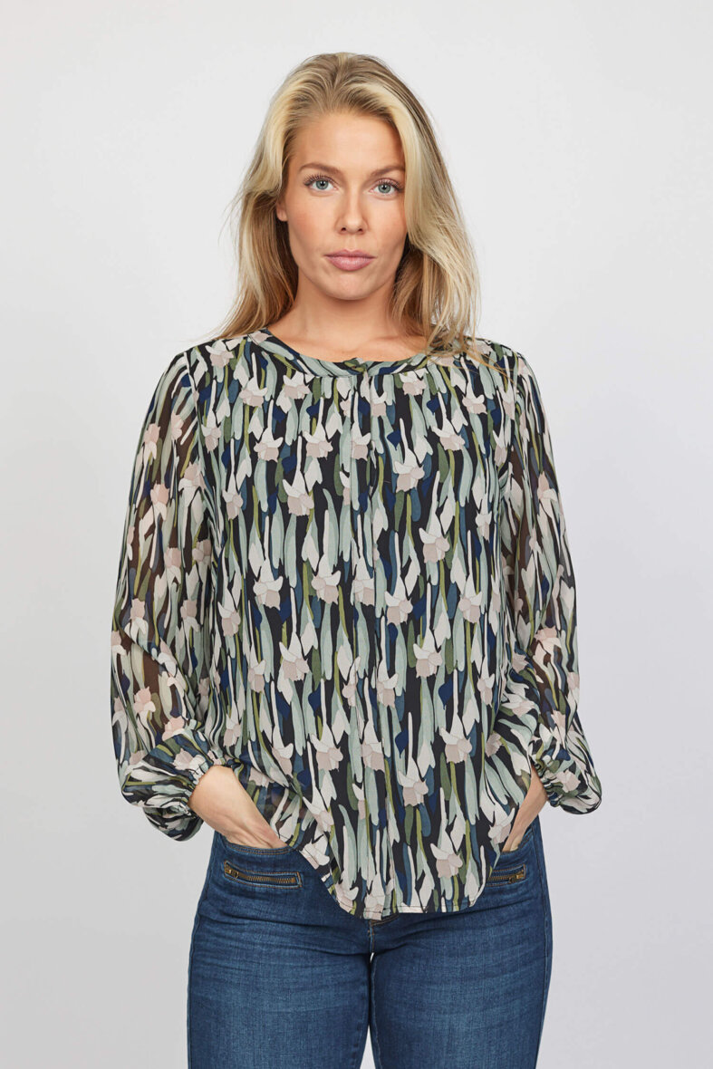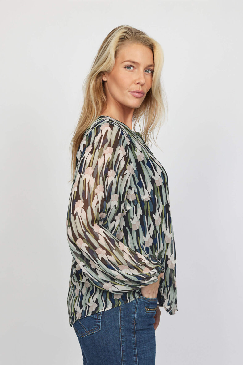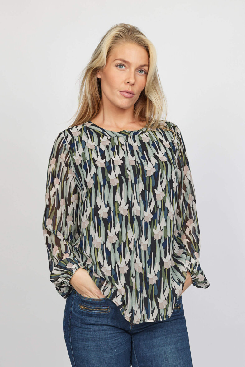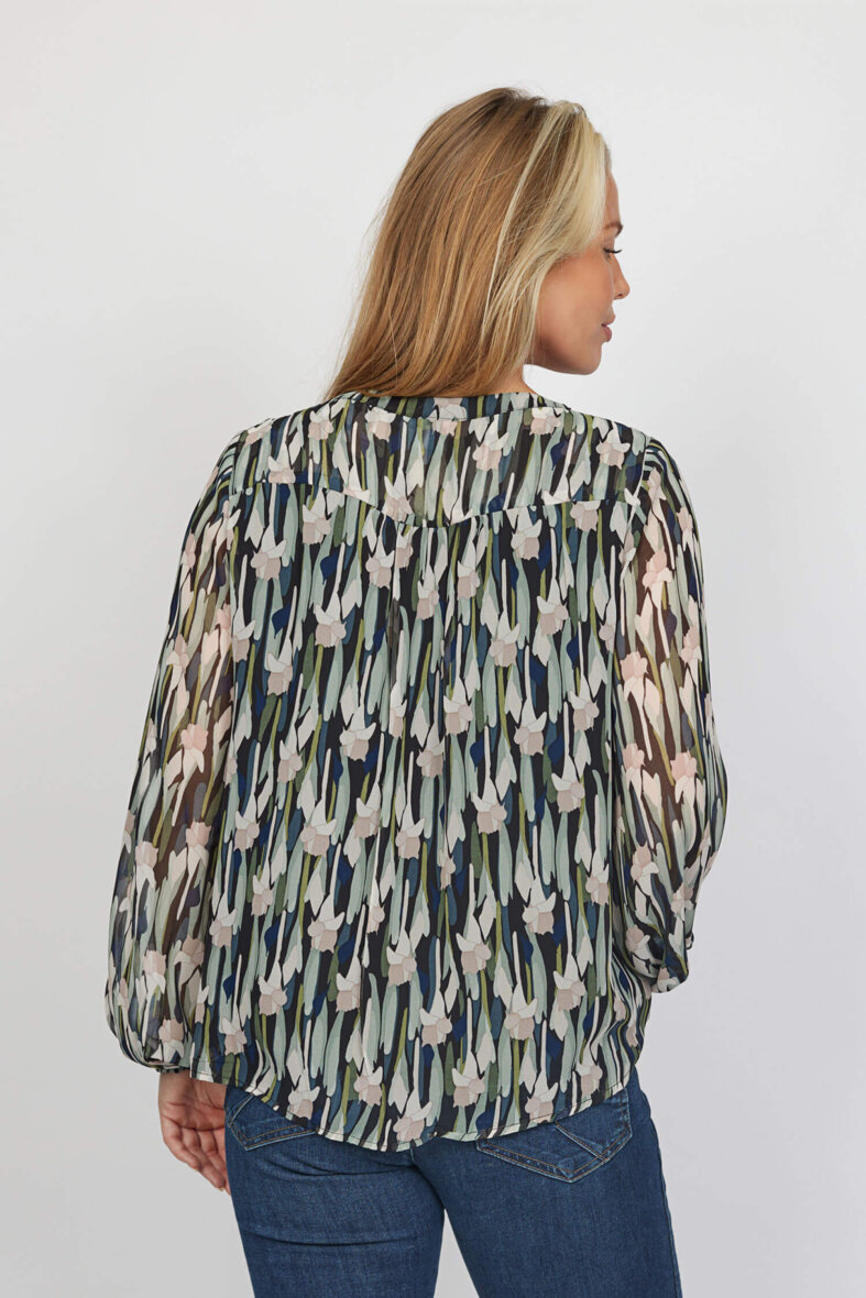 Skjortens rolige mønster i grønne og rosa toner, giver et fint og feminint udtryk. Skjorten er med rund hals med gennemgående knapper langs fronten, som er skjult af en flap.